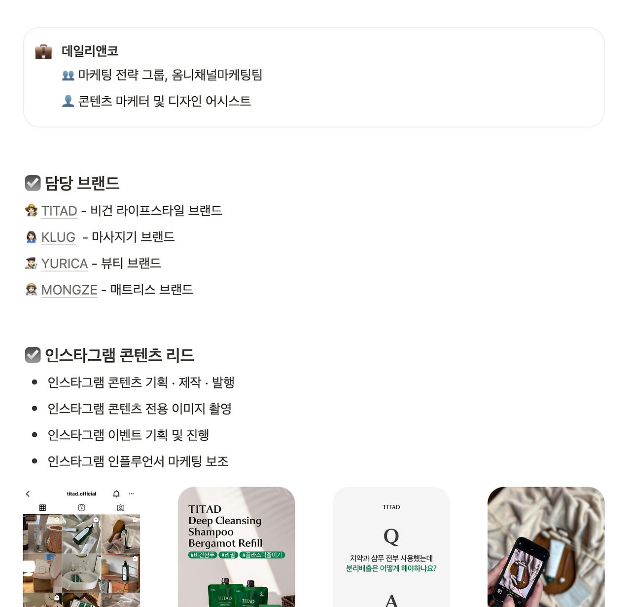 사이드 프로젝트 등에서 HR 업무 아닌 업무를 하다 보면 꽤나 많은 포트폴리오를 보게 되는데, 아무리 내용이 많아도 정갈하게 정리되어 있지 않으면 끝까지 읽어지지 않는다. 적어 내린 정보들이 전부 읽혀지지 않을 바에는 이것만큼은 알아줬으며 좋겠다 라는 방식으로 접근하는 게 유효하다고 판단했다. 이에 해당 회사나 프로젝트를 클릭하면 세부적인 내용을 최대한 심플하게 전하려고 노력했다. 최상단에는 소속을 다음으로는 소속에 대한 부가적인 설명을, 그리고 담당 업무에 대해 카테고리별로 보여주었다. 담당 업무에 대해서는 얼마나 자세하게 서술하면 좋을지 고민하다 불렛으로 깔끔하게 정리하기로 했다.
