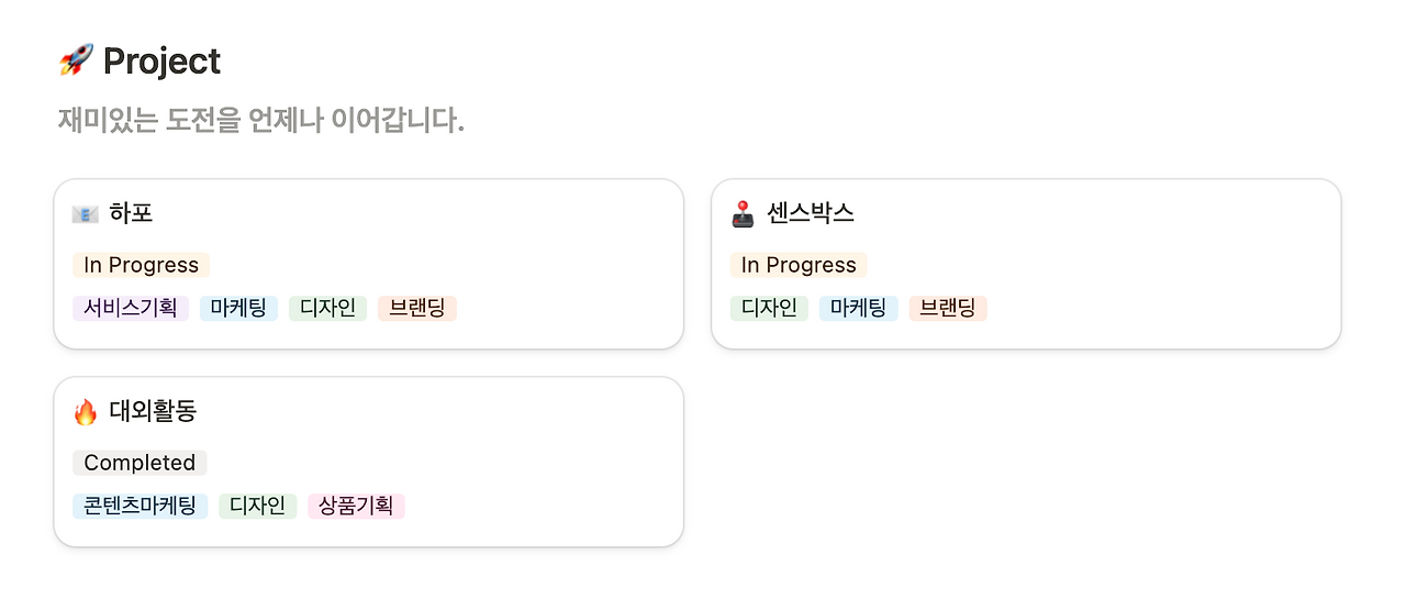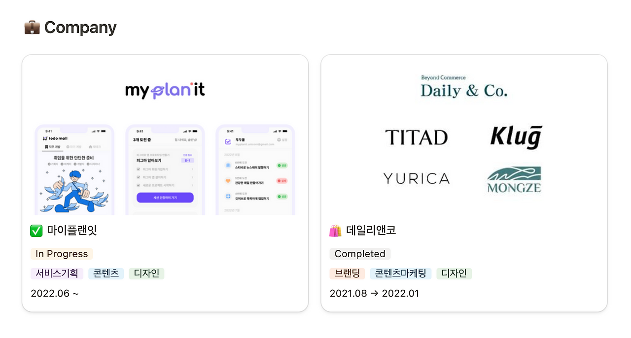 노션에서 데이터베이스를 표현하는 방법 중, 보편적으로 유명한 방식이자 개인적으로 좋아하는 방식은 '갤러리'이다. 상단의 Company 영역처럼 이미지로 강조할 수도 있고, Project 영역처럼 이미지는 없지만 콜아웃과 같은 형태로 강조할 수도 있다. 누가 봐도 클릭해보고 싶은 디자인이지 않은가. 갤러리 기능을 이용해 나의 커리어를 꾹꾹 눌러 담았다. 또, 클릭하기 전에 태그를 이용해 어떠한 분야의 태스크와 연결된 것인지 개괄적으로 전달했다.