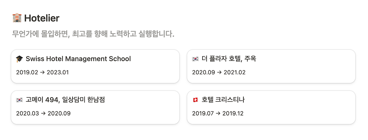 나는 의도치 않았지만 직종이 바뀐 케이스라 한 때는 온 맘을 다했던 호텔업계의 활동을 표시했다. 호텔에 미쳐 스위스에서 공부하며 일하고, 미슐랭 2 스타 레스토랑에서 최고의 서비스를 체득하기까지. 하나하나 적지는 못했지만 너무나도 많은 일들이 있었으며 이들이 현재의 나에 큰 영향을 미치는 것도 사실이다. 관심이 없을 수도 있지만, 나에 대해 빼놓을 수 없는 정보라 느껴 가볍게 덧붙였다.
