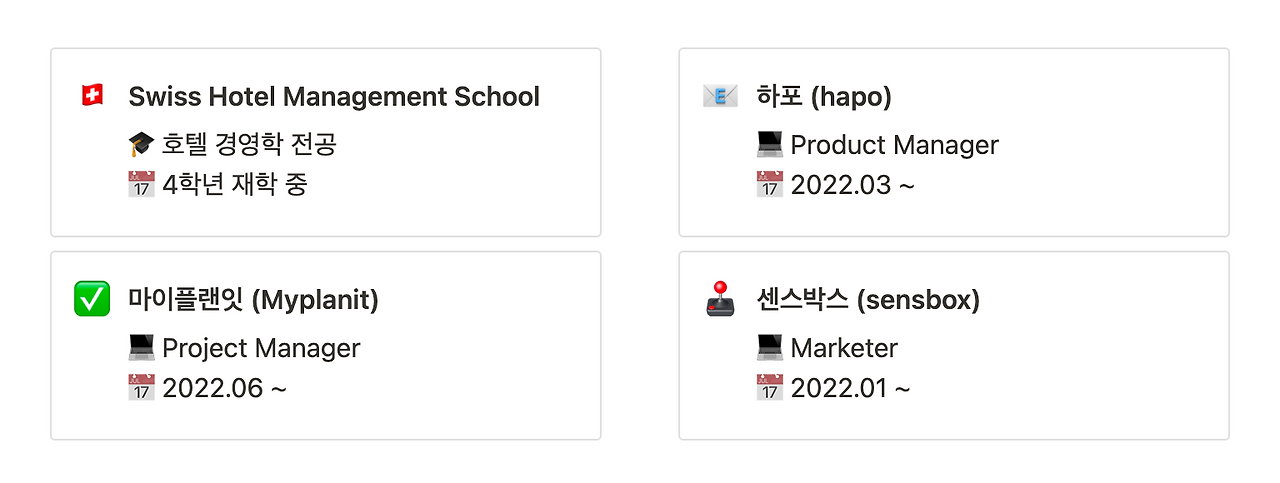 나는 현재 대학생이자 직장인이라 나의 대학과 소속을 기재했다. 그리고 대표적으로 진행하고 있는 사이드 프로젝트도 함께 적었다. 이는 나의 포트폴리오를 보는 사람으로 하여금 1) 스위스에서 학교를 다니는구나. 2) 소속이 정확히 어떠한 곳인지 모르겠으나, 학교를 다님과 동시에 여러 가지를 하고 있구나.라는 사실을 전하여, 앞으로 펼쳐진 여러 정보의 기본 세팅이 도전적이고 성장을 갈망하는 사람이었으면 하는 바람을 담았다.
