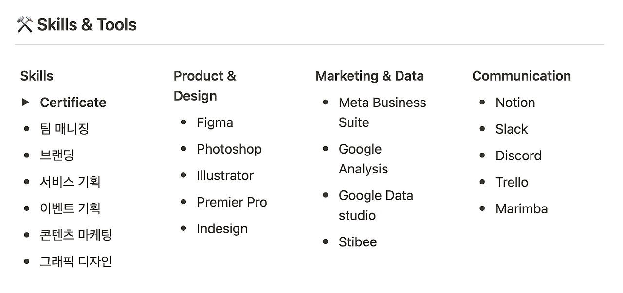 마지막으로는 커리어와 직접적인 관련은 없지만, 지금의 나를 만든 경험들을 나타내길 추천한다. 밴드와 같은 예체능 활동이 올 수도 있고, 학교 동아리와 같이 사소하지만 큰 영향을 준 활동들이 있을 수도 있다. 군대와 같은 경험도 전환점이 되었다면 충분히 포인트가 될 수 있다고 생각한다.
