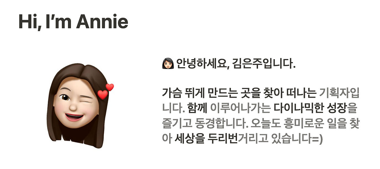 사진의 경우, 포트폴리오의 목적에 따라 프로페셔널한 프로필 사진을 사용하기도, 귀엽고 장난스러운 셀카를 넣기도, 혹은 나의 예시처럼 실제 얼굴 없이 나를 나타낼 수도 있다. 나는 기존에는 인턴을 위한 포트폴리오로 사용한 만큼 프로필 사진을 삽입하였으나, 최근에는 사이드 프로젝트와 같이 보다 가벼운 목적으로 사용하는 경우가 많아져서 조금 귀엽게 바꿔보았다. (귀엽다고 해줘요