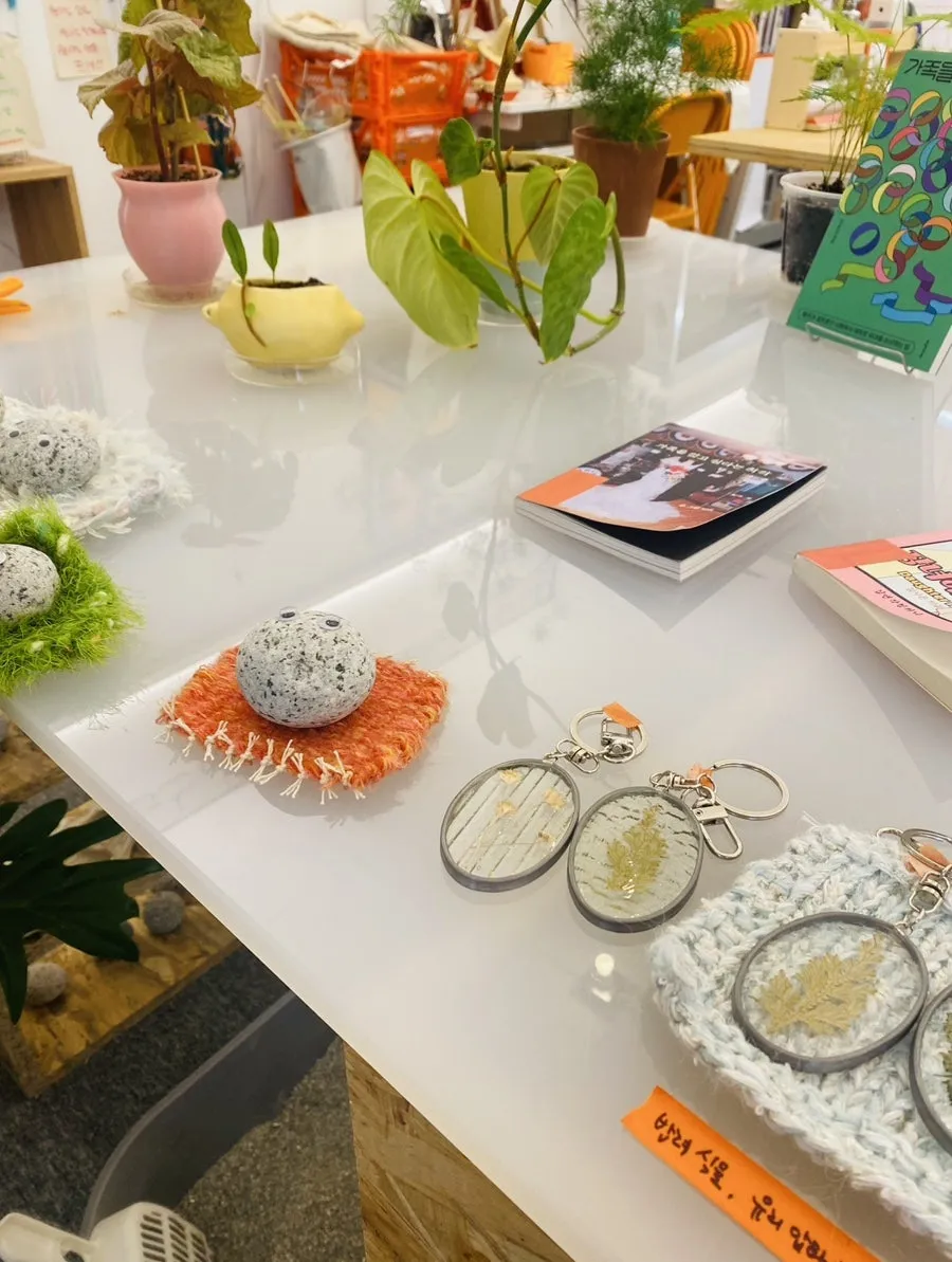 오른쪽 벽에 해방촌의 모습을 담은 엽서가 꽂혀 있었다. 서로 기대어 앉은 연인, 노을이 지는 풍경, 나무가 바람에 흔들리는 모습이 담겼다. 주인이 직접 만든 것 같은 열쇠고리도 있었다. 투명한 가운데 말린 꽃이 들어 있었다. 반려 상품이라고 소개해 놓은 게 귀여웠다. 가운데에는 넓은 테이블과 의자가 있어서 차를 마시며 책을 읽을 수 있었다. 차를 주문하거나 책을 구매하면 테이블을 이용할 수 있었다. 실뭉텅이가 쌓여 있는 바구니도 보였다. 실을 가져다 뜨개질을 해도 된다고 했다. 식물이 곳곳에 놓여서 시원한 분위기가 났고, 화분과 씨앗도 판매하고 있었다. 개인의 취향이 듬뿍 담긴 공간이었다. 흰 고양이도 천천히 걸어다녔다.