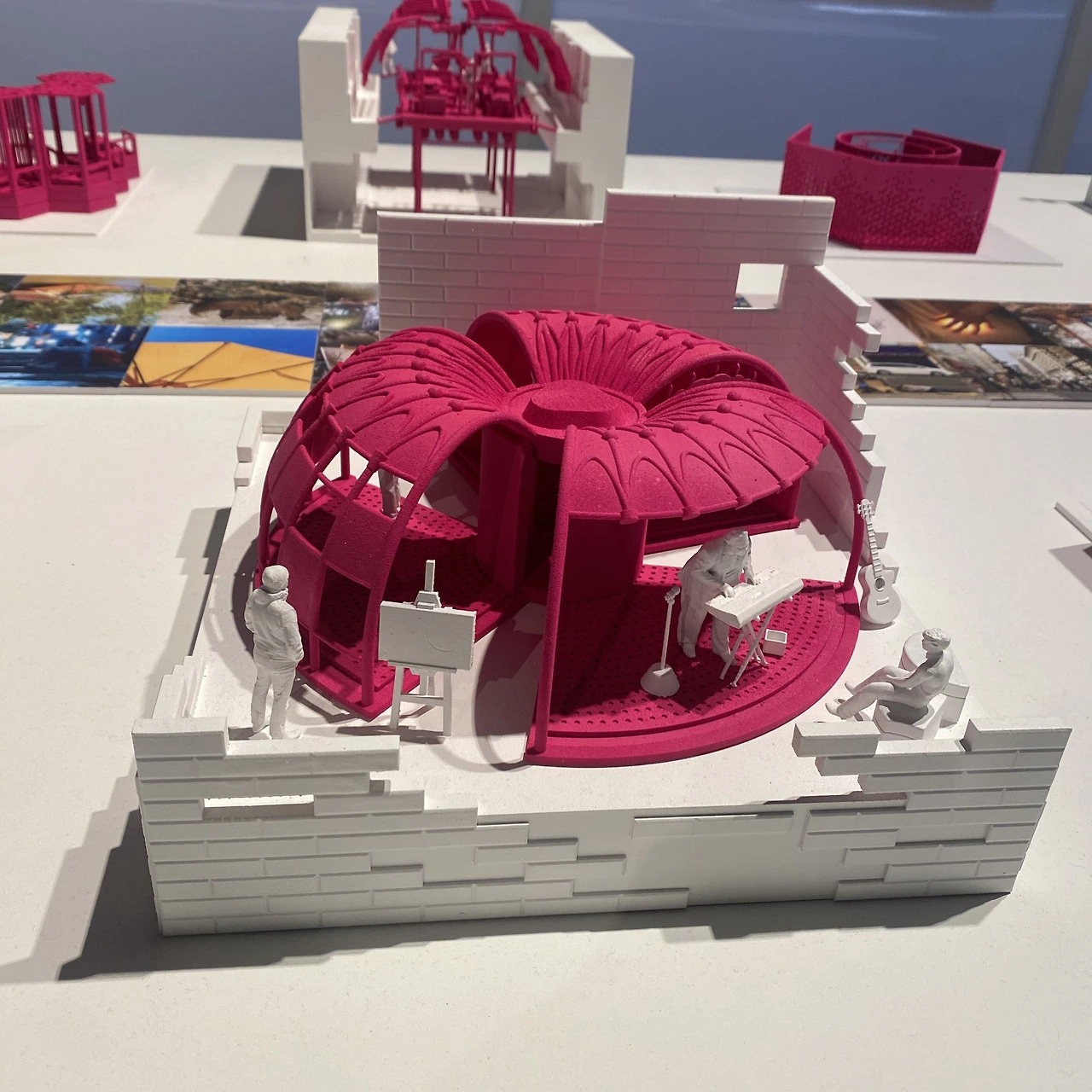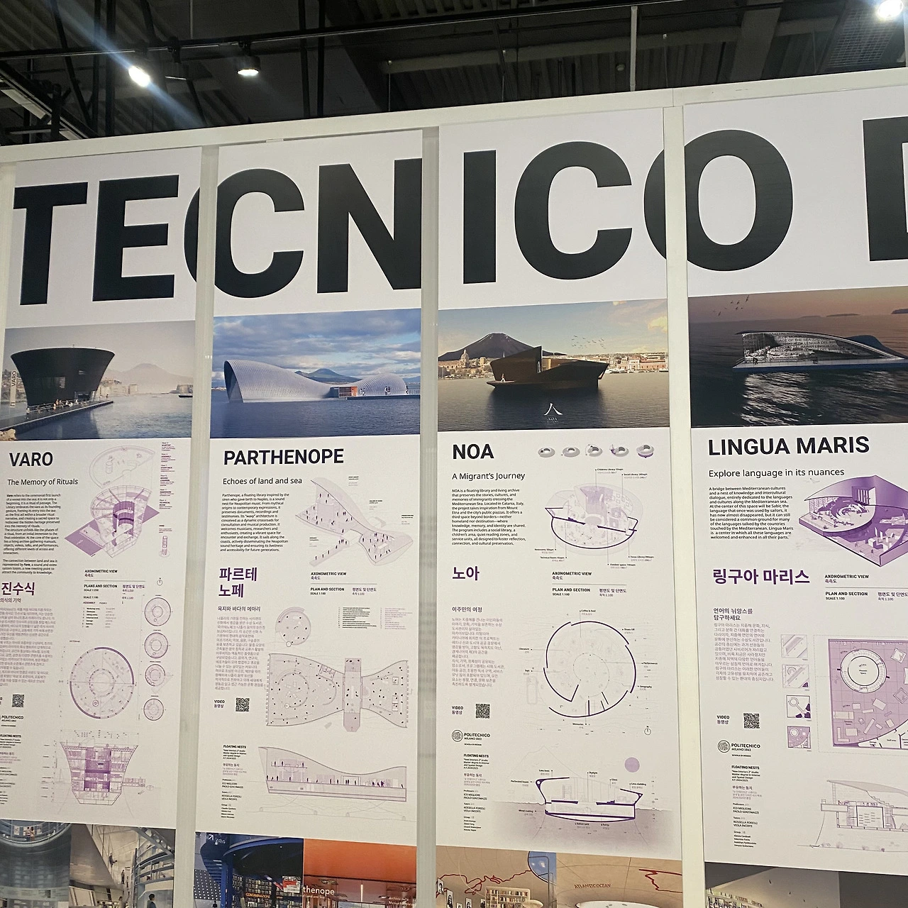 이러한 건축 설계 모형도 학생들이 각자 만들어낸 것이다. 굉장히 독특한 편인데 위쪽에 이미지로 구현한 사진이 있다. 한 지역의 랜드마크가 될 수 있을 정도로 세련된 디자인이라는 것을 알 수 있다. 왼쪽에서 두번째 사진에 있는 파르테 노페 같은 경우는 수상 도서관인데, 사이렌의 신화에서 영감을 받았다고 한다. 유선형의 몸체가 음악의 선율을 표현한 것 같고 상당히 유려하다. 악보와 음원등을 보관하여 예술과와 음악가들의 커뮤니티를 형성하는 공간적 프로젝트라고 한다.