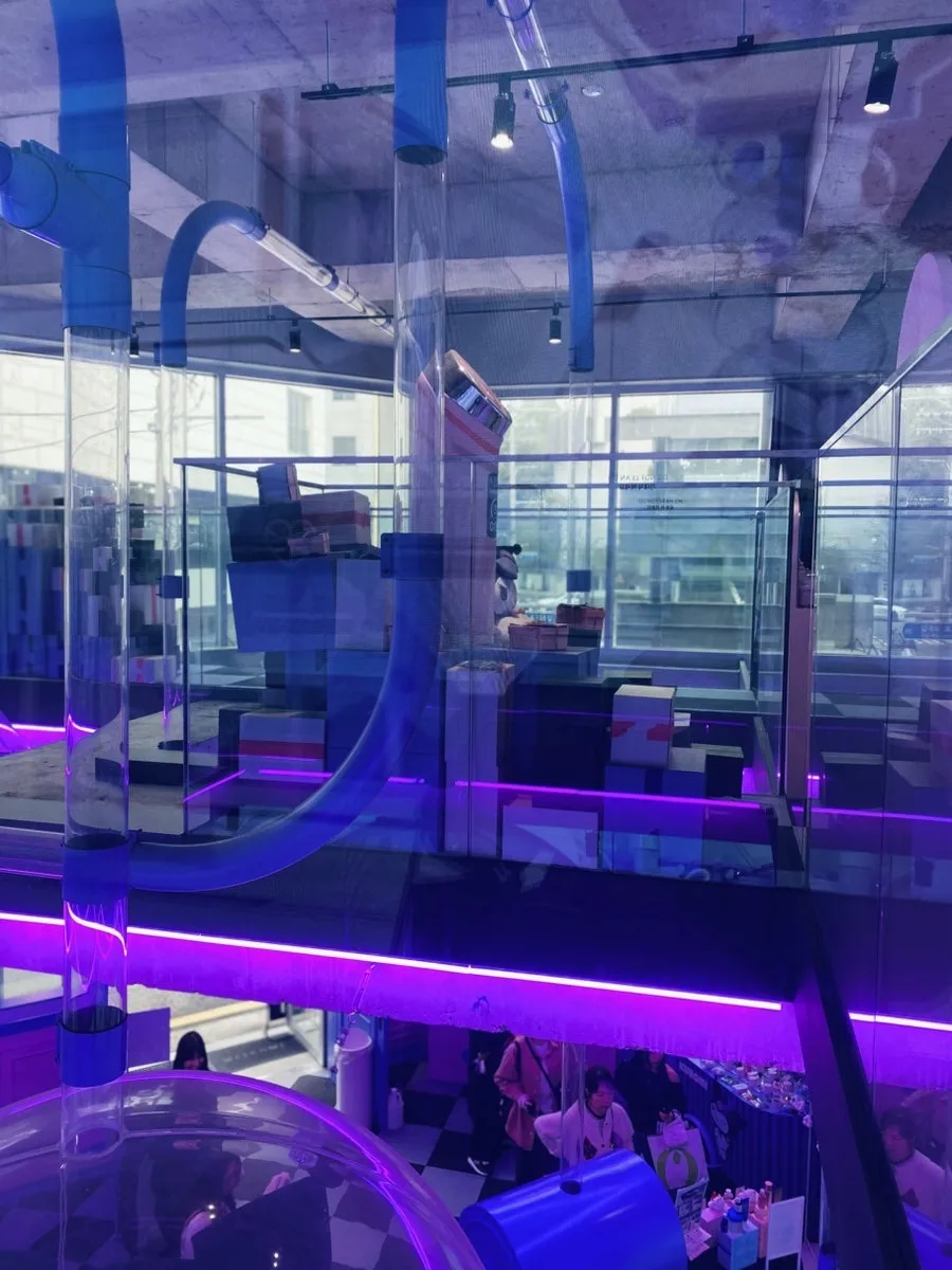 1층과 2층에는 쿠로미 콜라보 제품이 주로 있었어요. 여자 아이들에게 선물하면 환호성을 받을 것 같은 화장품 선물 세트가 있었어요. 어릴 적에 공주님 인형을 가지고 놀 때 볼 수 있을 법한 화장품 세트였는데, 실제 기능이 있는 크림 같은 것이라서 아이들이 정말 좋아할 것 같더군요. 3층부터는 콜라보 제품이 아닌 메디큐브 제품들을 만나볼 수 있었어요. 고주파 마사지기라든가, 크림류가 보였습니다. 마사지기 가격대는 30만원 선이었어요. 여러가지 제품을 보고 구경할 수 있어서 좋았는데요, 지하 1층에는 브랜드 Nerdy의 의류와 가방이 50%까지 세일중이었어요. 아이유가 입은 걸로 유명한 보라색 츄리닝도 보였습니다. 대부분이 츄리닝 제품이었어요. 크기가 작은 하늘색 백팩도 있었는데 리본이 달려 있었고 주름이 질 정도로 가벼운 소재였어요. 가벼운 공주님 느낌? 발레 코어 식으로 꾸밀 때 사용할 수 있을 것 같더라고요. 1층부터 4층 정도까지 구경할 수 있는 게 많아서 좋았습니다.