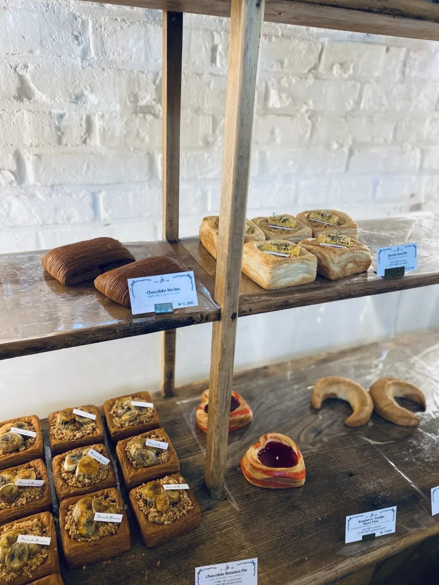 그리고 옆쪽에는 이렇게 빵이 있어요. 나무로 된 진열대라서 꼭 유럽에 온 것 같더라고요. 겹겹이 느껴지는 파이형 빵들이 보이고, 그 안에 재료도 듬뿍 쓰였네요. 잼이 들어간 하트 모양 페스츄리도 맛이 좋아 보여요.