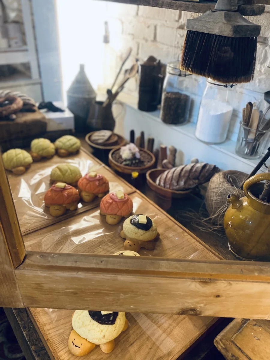 그렇지만 저희는 여기 보이는 거북이 빵을 골랐습니다. 메론빵 비슷한 건데 거북이 얼굴과 다리가 달려 있어서 정말 귀엽죠. 붉은 색과 흰 색 거북이에는 무슨 크림이 들었는지 잘 모르지만 녹색 거북이에는 예상대로 메론 크림이 들어 있었어요. 할머니 부엌에 온 것 같기도 한, 빵집 진열대였습니다.