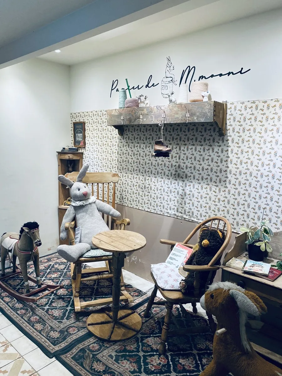 이건 올라가는 2층으로 올라가는 계단 주변에 만들어진 공간이에요. 이렇게 꾸며진 것들로 인해 빠니드 엠 무니가 어떤 감성의 카페인지 짐작이 가시나요? 저는 고전적인 유럽의 미를 현대적으로 재해석한 곳처럼 느껴졌어요. 미술관이나 박물관처럼 보이기도 하는데, 가정집처럼 따뜻하게 느껴지기도 하고요. 토끼 인형이 굉장히 귀엽죠. 회색 토끼가 검은 곰인형과 함께 의자에 앉아 있네요. 망아지 인형도 예쁘고 탈 수 있는 말 의자는 꼭 어릴 적 호두까기 인형에서 본 것처럼 생겼네요. 거기에서 전쟁놀이를 좋아하는 남자아이에게 크리스마스 선물로 저렇게 움직이는 말 장난감을 준 것 같은데요. 걸려 있는 장화도 보이세요? 분위기를 완성시키는 것 같아요. 갈색이 많이 쓰여서 온화한 무드를 만들고 러그도 청색에 꽃무늬가 들어가서 우아해 보여요.