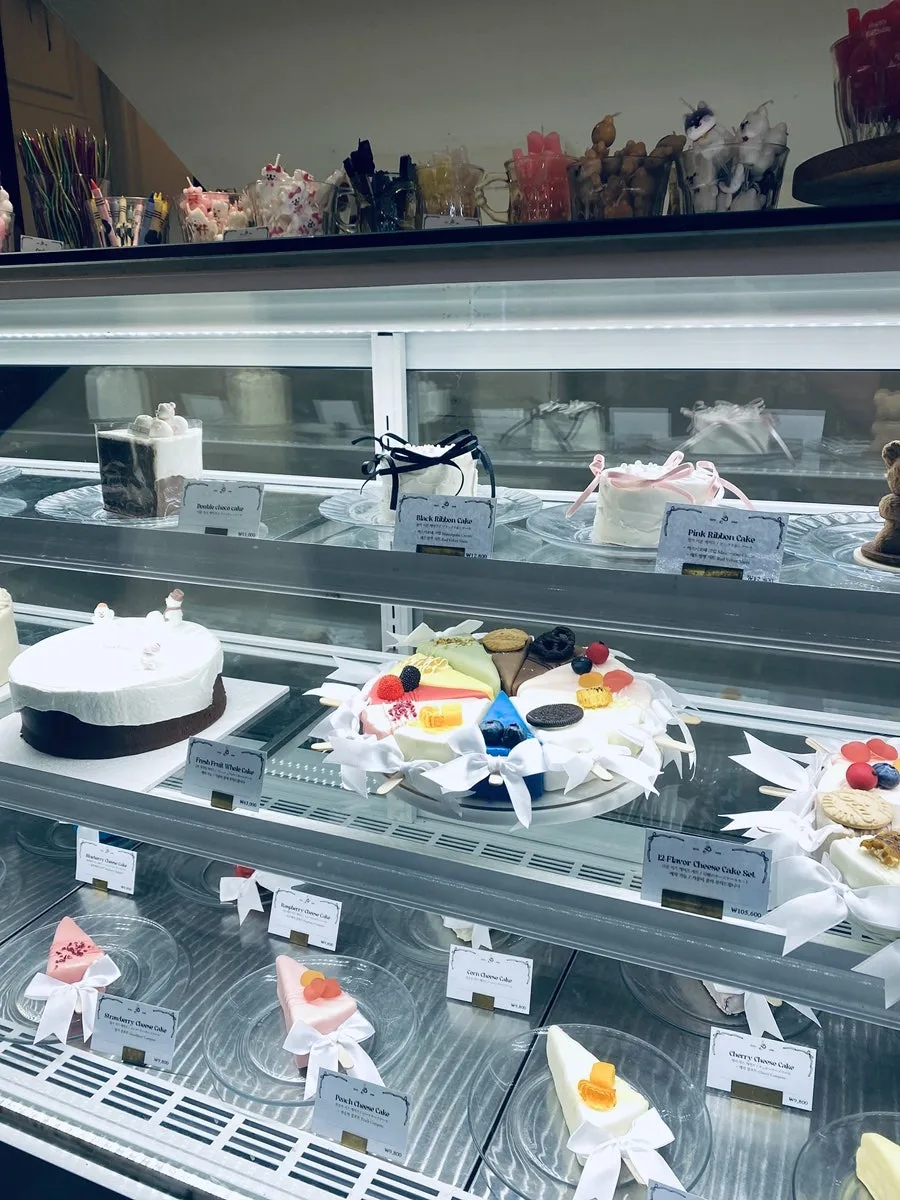 리본 모양 크루아상도 있지만 이렇게 케이크도 진열대에 들어 있어요. 가격대는 청담동 답게 꽤 있는 편이에요. 조각 케이크가 만원이 넘어갔거든요. 가장 아래층에 조각 케이크들이 꼭 치즈같이 생기지 않았나요? 알고 보니 초콜릿 코팅이 되어서 단단하고 부드러워 보이는 거더라고요. 여러 가지 맛의 케이크를 섞어서 먹을 수 있는 홀케이크도 좋아 보이네요. 다만 가격이 10만원이 넘어간다는 게 놀랍네요. 웨딩 케이크처럼 흰색에 리본이 달린 작은 케이크도 보이고요, 사진에는 안 담겼지만 샤인머스켓 케익과 무화과 케익도 있었어요. 과일이 풍성하게 들어가고 크기도 커서 맛있어 보였는데 저녁에 식사를 해야 해서 주문하지는 않았어요.