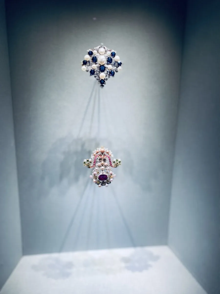 샹들리에를 방불케 할 정도로 화려한 브로치인데 이를 보면 중반부로 갈수록 창의성이 더 발현된다는 것을 느낄 수 있다. 어떤 우아함의 선을 제거하고, 그 위로 더 뚫고 나가고자 하는 의지가 엿보인다. 보석의 개수는 다양하고 색도 다채롭게 쓰였는데, 의도는 깔끔하고 명확하게 전달된다. 위에 있는 파란 브로치는 진주와 초록 빛깔이 나는 보석을 다소 비슷한 비중으로 배열해서 무게감을 주고자 한 게 엿보인다. 아래 것은 하나의 젬스톤을 주인으로 두고, 그 위에 크기가 작은 보석들을 배열해서 안정감을 추구했다. 화려한데 비해 깔끔한 곡선의 방향이 모티브를 정확하게 따라 구현하였다. 이 브로치가 낚시용 도구를 모티브로 하였든 아니든, 아직 중반부까지는 자연주의로 빠지지 않고 문명과 문화의 영역 안에서 작용하고 있다는 것을 느낄 수 있다.