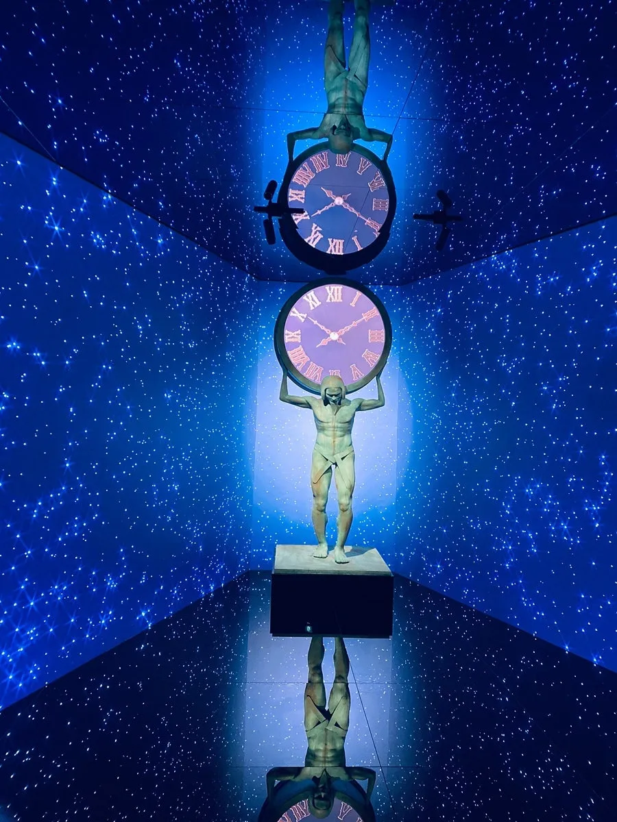 전시회에 들어가면 아틀라스가 시계를 떠받치고 있는 조형을 가운데 두고 그 양옆으로 별무리가 펼쳐져 있는데 벽과 바닥은 모두 미디어아트 영상을 쏠 수 있게 되었다. 하필 아틀라스와 시계 조형을 이 전시회의 도입부로 둔 것은, 티파니앤코 브랜드가 시간을 들여 쌓은 명성을 떠받치고 있는 현재의 상황과 전시 자체를 형상화한 것 같았다. 아틀라스는 본래 하늘을 떠받치는 존재이다. 벌을 받아서 그렇게 하는 것인데, 만약 아틀라스가 하늘을 떠받치고 있지 않다면 하늘은 무너지고 말 것이다. 티파니앤코의 명성도 그와 같다. 전세계 하이엔드 주얼리 브랜드 중에서 아주 높은 위상을 차지하고 있는데 그걸 티파니앤코의 자존심으로 하늘과 같다고 해석해보면, 현재 그 명성을 유지하기 위해서 애쓰고 있는 티파니앤코의 모든 사람들은 아틀라스의 역할을 하는 것으로 볼 수 있다. 하필 시계를 떠받치고 있는 것도 200년 가량동안 일궈낸 위상의 무게가 크기 때문일 것이다.