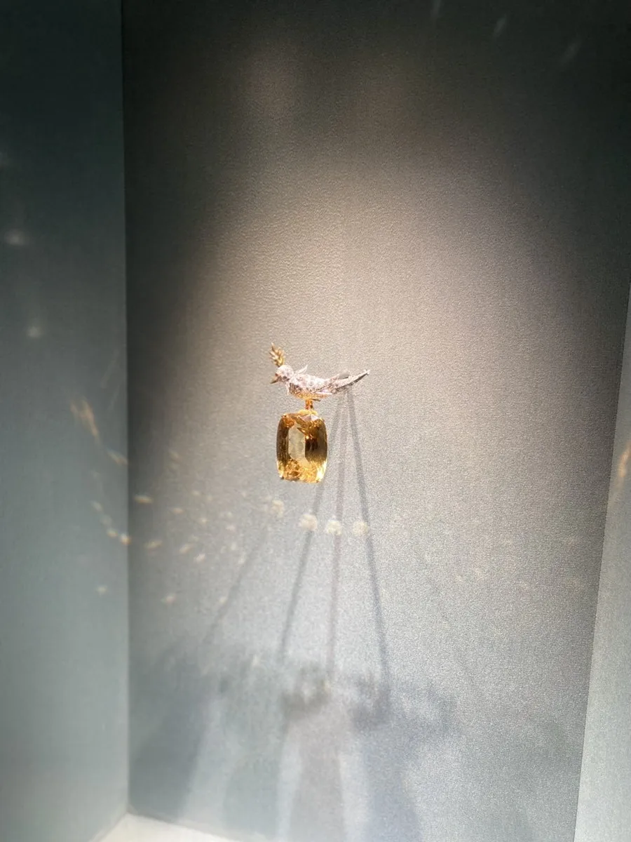 쟌 슐럼버제의 작품으로 넘어가면 확실히 아르누보의 영향을 깊게 받았다는 걸 알 수 있다. 다른 작품들에 비하면 비교적 깔끔한 편인 새와 커다란 젬스톤으로 된 작품이다. 새의 깃털의 방향이 각기 다른 깊이감을 주면서 뻗어 있다. 황금색 보석은 세로로 긴 편이라서 무겁지 않고 전체적으로 세련된 미감을 자랑한다. 보석의 두께 때문에 음영이 짙게 지고, 날지 않는 새인데도 솟아 있는 깃털들 덕분에 가볍고 날렵하며 명랑하게 느껴진다. 보석을 물고 어딘가 이동하는 것 같아 보이기도 한다. 새가 금방이라도 날 수 있는 것처럼 얄쌍하기 때문일까. 보석이 워낙 커서 그 위에 내려앉은 것 같기도 하지만 다시 날아오를 자세이다. 황금의 나라로 인도해줄 수 있는 것처럼 온화한 기분이 들면서 아름답다는 생각이 든다.