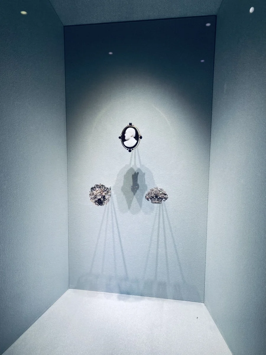 이것은 초창기 작품인데 후기의 아르누보 양식을 딴 작품들과 비교하면 절제미가 느껴진다. 꽃 모양과 왕관 모양의 브로치, 그리고 사람의 옆모습을 넣은 브로치인데 세 개가 배열된 방식은 마치 꽃과 왕관 위에 사람이 놓여 있다고 넌지시 전달하는 것 같다. 좀 더 화려한 편인 꽃과 왕관 모양 브로치 위에 상대적으로 단정한 사람 모양의 검은 브로치가 놓여 무게중심을 잡아준다. 꽃잎 위에 화려하게 수를 놓은 것 같은 보석의 향연과, 꽃다발을 씌워놓은 것 같은 왕관 브로치. 만약 이 둘만 있었으면 고급스러움은 격하되었을 것 같은데, 검고 흰 사람 브로치로 인해 우아한 생명을 얻은 것처럼 보인다.
