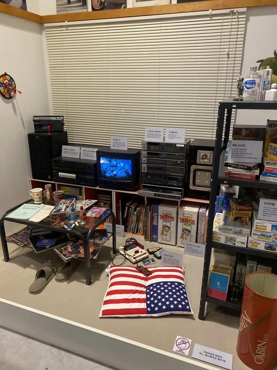 이건 1980년대 어느 애니메이션 팬의 방이다. 일본답게 방은 좁은 편이지만 알차게 방을 꾸며 놓았다. 작은 브라운관 텔레비전에 라디오도 있고, 음향기기도 상당히 좋다. 게임기도 있고, cd 플레이어도 있다. 이 작은 방에서 소위 덕질이라는 것을 얼마나 열심히 했을까. 오타쿠로 불리며 방 안에서 애니메이션만 본다고 해도 행복했을 사람들, 어느새 시간이 이렇게 흘러 그들이 50대가 되었을 것이다. 애니메이션의 부흥기 동안 수많은 애니메이션에 둘러싸여 그것만으로도 행복했을 그들의 삶이 느껴진다. 왠지 아늑하고 이 방에 들어 있는 여러 작품들이 얼마나 소중하고 보물같았을지 물씬 느껴진다.