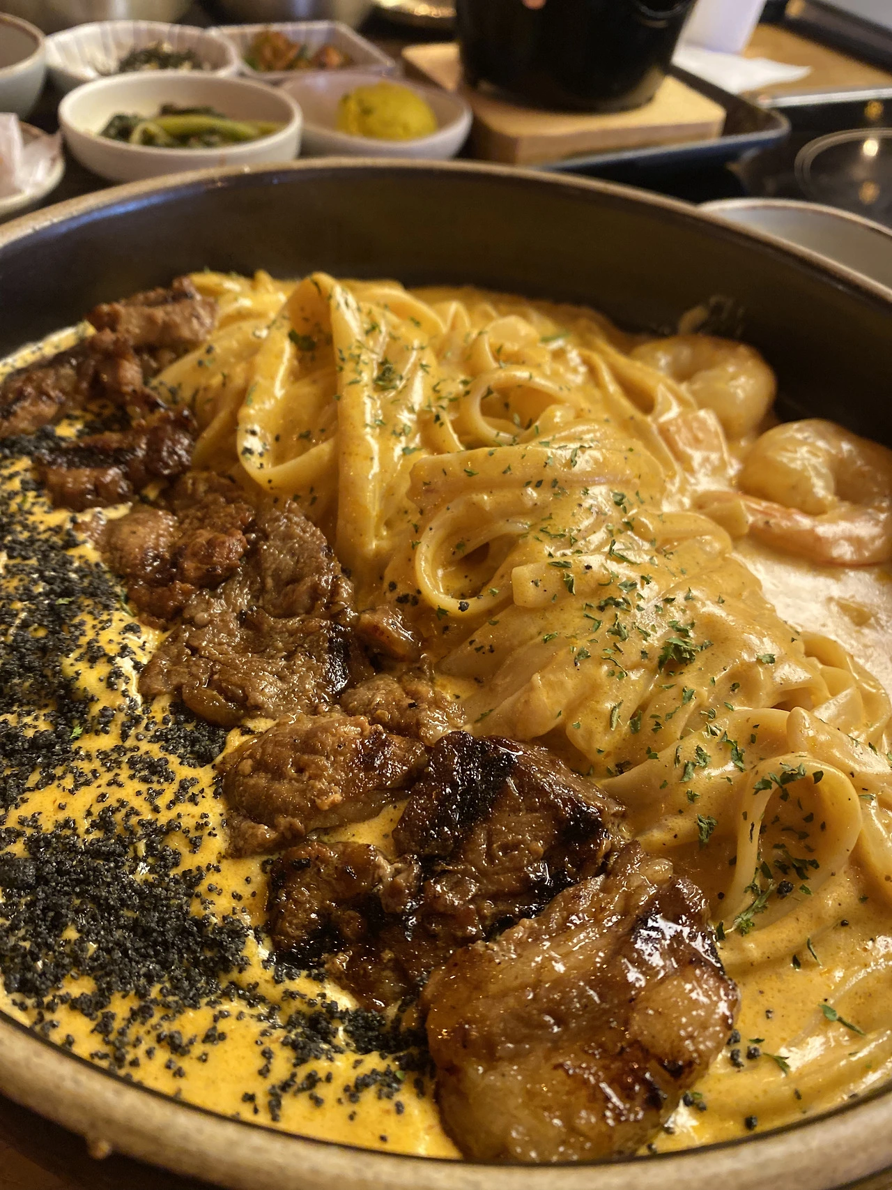 오래 걸리지 않아 음식이 나왔다. 내 파스타 안에 들어 있는 고기는 크림 소스에 버무러져서 부드러운 편이었고, 남자친구한테 나온 갈비 구이는 불에 구운 맛이 나고 고소했다. 치즈 감자전을 먹어 보니 바삭하게 구워진 감자가 씹히고, 그 위에 잔뜩 올려져 있는 치즈가 느끼한 맛을 더했다. 내 파스타의 면은 두꺼운 편이었고, 일반 크림 파스타보다 좀 더 짙은 노란기가 돌았다. 주황색에 가까운 색이었다. 면이 두꺼워서 씹는 맛이 좋았고, 뚝뚝 잘 끊어졌다. 파스타 소스에는 매운 가루가 들어가 있는지 가끔 매콤한 맛이 강하게 느껴졌다. 같이 나온 고기를 먹으니까 오히려 크림 소스에서 느껴지는 느끼한 맛이 중화되었다. 남자친구의 고기도 몇 점 집어 먹으면서 식사를 맛있게 했다.