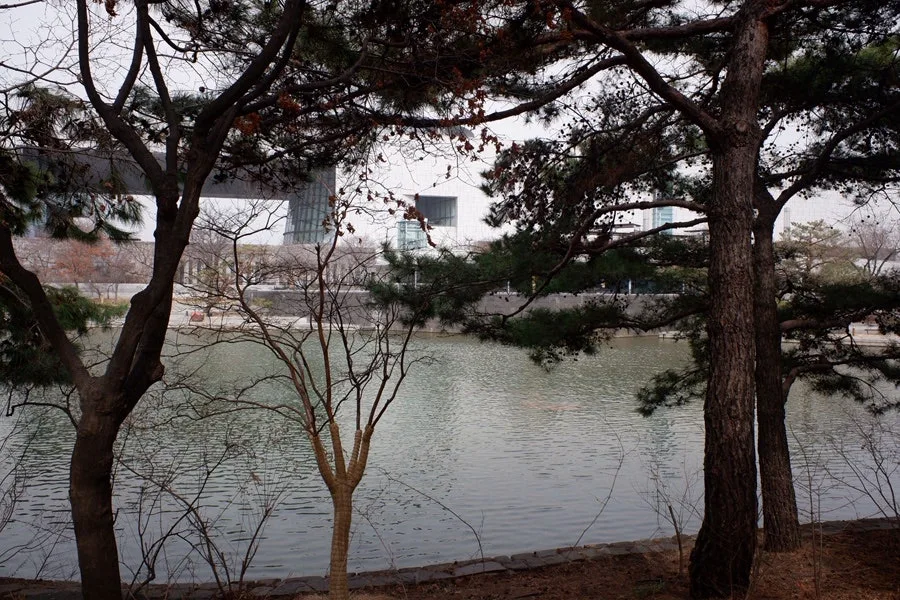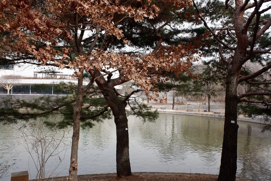 우리는 이촌역에서 내려 국립중앙박물관으로 걸어갔다. 사람들이 많았고, 우리는 바로 박물관 안으로 들어가는 대신 주변을 좀 둘러보기로 했다. 호수 옆에 서 있는 정자가 보여서 그곳으로 먼저 향했다. 정자에는 신발을 벗고 올라가시오, 라는 안내가 있었다. 정자 위에 먼지가 좀 깔려 있어서 신발을 벗고 올라가지는 않았고, 그 밑에 계단 쪽에서 사진을 찍었다. 내가 갖고 있는 카메라 후지필름 xf10은 적당히 필름 카메라틱한 색감을 갖고 있고, 쨍하거나 강하지 않은 대신 은은한 맛이 있다. 사진 찍는 게 재미있고 좋아서 여러 장을 찍었다.