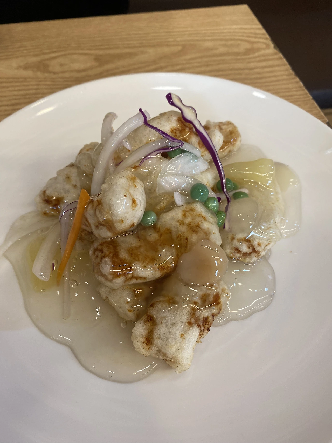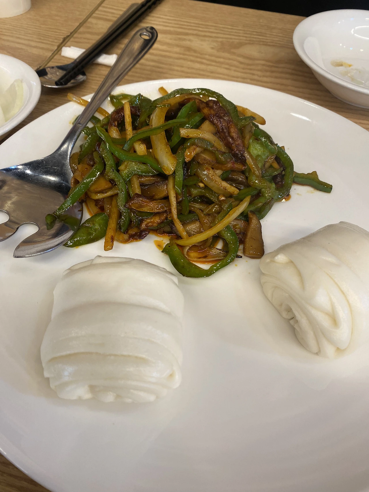 남자친구가 탕수육을 먹으면서 찹쌀 탕수육에는 찹쌀이 안 들어간다는 걸 알려주었다. 감자 전분으로 쫀득하게 할 뿐이라고 했다. 하얗고 쫀득한 탕수육 껍질을 보면서 나는 항상 찹쌀을 생각하며 먹었는데, 아니라는 걸 알고 나니 놀라웠다. 남자친구 뒤쪽에는 중국 왕실 그림이 있었는데, 매끄러운 금색 벽을 깎아서 무늬를 만들어낸 것 같았다. 사람과 가마, 신하와 전통 궁궐이 보였다. 고추 잡채에는 꽃빵이 두 개밖에 안 나왔다. 내가 꽃빵을 반으로 쪼개서 먹자 남자친구가 겹겹이 찢어서 먹는 것이라고 했다. 하얀 꽃빵 위에 고기, 파프리카, 양파를 볶아 만든 잡채를 올려서 먹자 짭쪼름한 양념이 심심한 꽃빵 위로 뒤섞여 조화를 이뤘다.