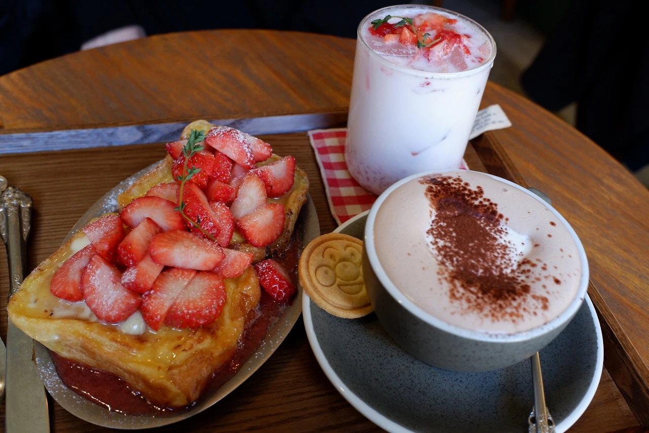 우리는 행궁 안에 있는 카페에 들어갔다. 디데이 하우스라는 곳이었다. 딸기가 잔뜩 올라간 프렌치 토스트와, 따뜻한 초콜릿 음료와 딸기 우유청을 주문했다. 프렌치 토스트는 계란물에 잔뜩 절여져서 부드러우면서도 수플레보다는 꾸덕했다. 그 위에 딸기 잼이 잔뜩 올라갔다. 초콜릿 음료도 진하고 부드러웠다. 우리는 이야기를 많이 나누었다.