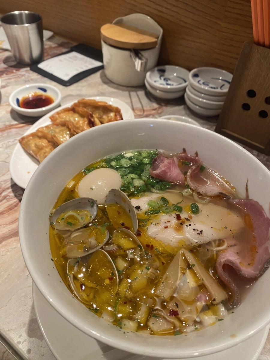 우리는 고터 신세계 백화점 푸드코트에서 점심으로 라멘을 먹었다. 영화 보러 왔을 때 먹으려다가 웨이팅이 애매해서 못 먹었던 라멘집이었다. 봉골레 조개가 많이 들어갔다. 같이 준 차슈를 라면 국물에 넣었더니 천천히 익었다. 남자친구는 매운 라멘을 먹었고, 나는 고소한 라멘을 주문했다. 군만두도 사이드로 주문했다.