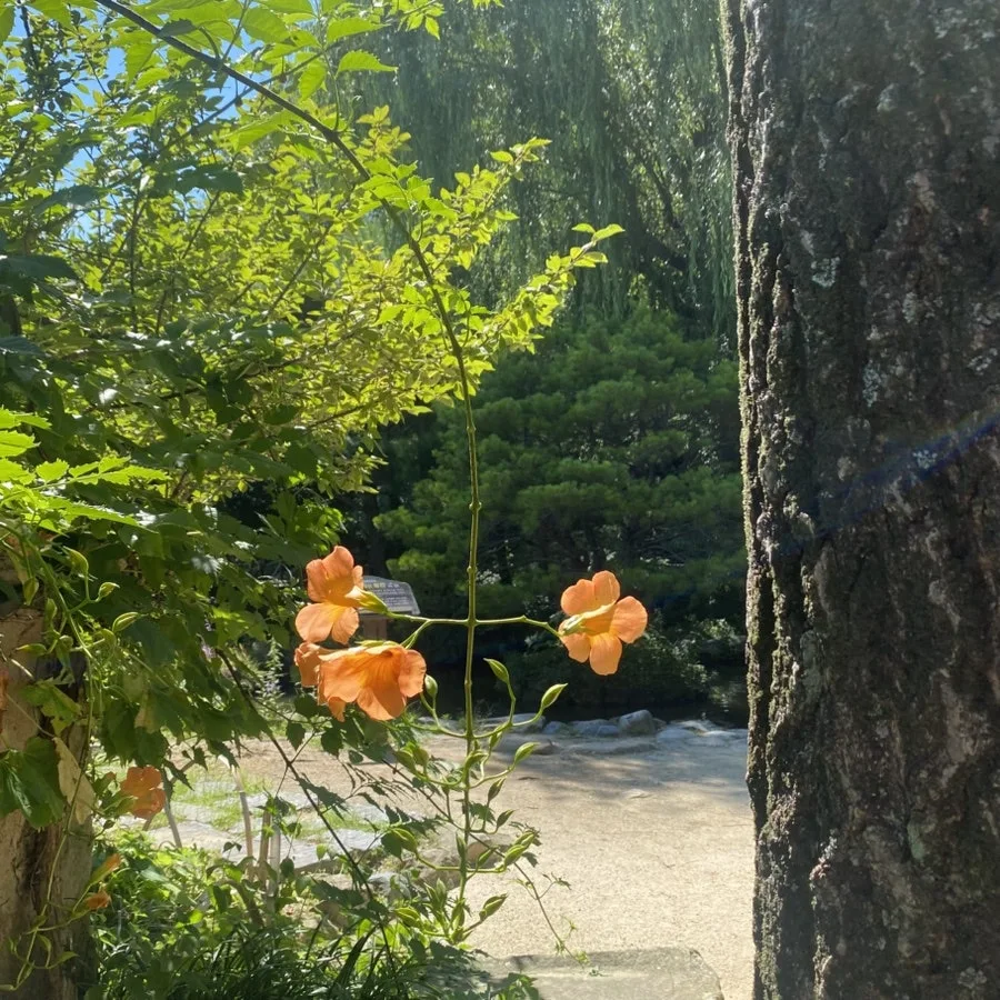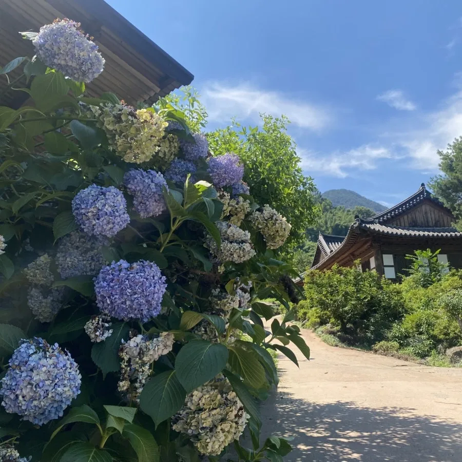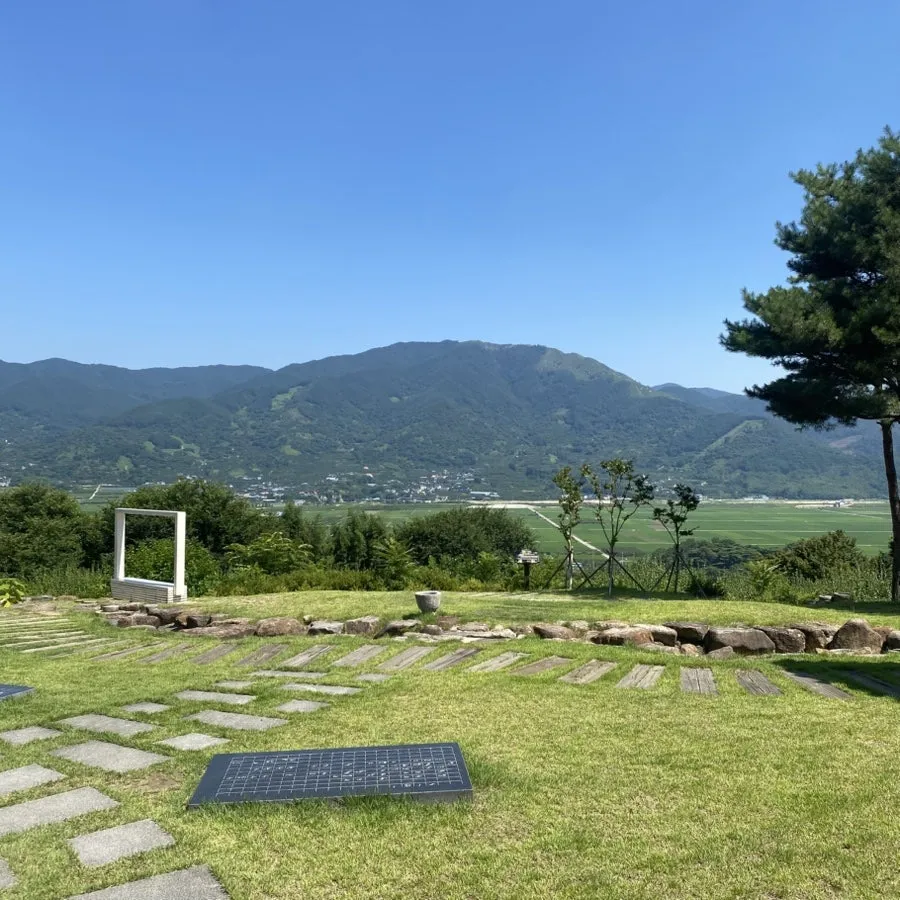 그리고 환하게 피어난 수국꽃 무리를 지나서 박경리 문학관으로 갔다. 넓은 마당에 푸릇한 잔디가 생명력이 있고, 돌로 지어진 구조물까지 고즈넉하니 분위기가 좋았다. 문학관 안으로 들어가기 전에 지리산을 보았다. 저 너머로 별당아씨와 환이가 달아났을 것이다. 참 가깝다. 지리산이 자락을 이렇게까지 뻗어 있어서 그 힘도 이어지는 것 같다. 아주 넓고 큰 산이니 박경리 문학의 힘도 여기에서 나온 것 같다. 이 터에는 산의 정기가 갈무리 되어 있는 것 같다. 편안하게 탁 트여 있어서, 넓은 논이 그대로 내려다 보였다. 최참판댁네에서 만석 논을 내려다보는 정경이 그대로 내 눈에 담겨서 감동을 주었다.