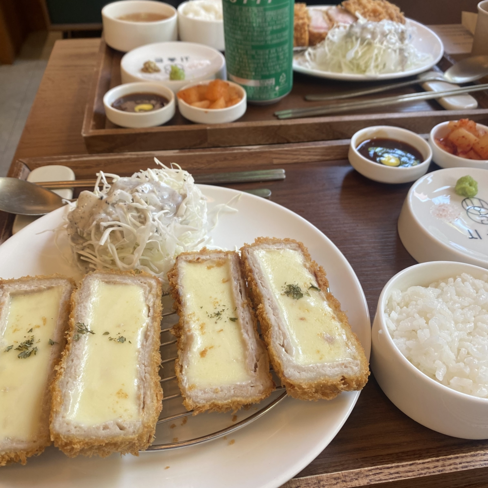 나는 치즈 돈까스를 주문했고 남자친구는 특등심이 없어서 등심 돈까스를 주문했다. 음식이 나오고 나서, 내가 남자친구 등심에 들어 있는 붉은 선은 무엇이냐고 물었다. 남자친구가 비계와 살코기가 갈라지는 지점이라고 알려주었다. 비계가 있어서 부드럽다고 했다. 나는 치즈 돈까스를 한 입 먹었는데, 바삭바삭한 튀김 안에 살코기가 느껴지고 늘어나는 치즈도 굉장히 맛있었다. 잡내가 하나도 없었고 좋은 질의 고기가 느껴졌다. 나는 시올돈의 이 깔끔한 맛이 좋다. 저번에 먹었을 때도 무척 맛있었는데 이번에도 실망을 시키지 않았다. 신선하고 좋은 고기를 사용하는 게 느껴져서 먹을 때 기분이 좋다. 치즈도 좋은 치즈인지, 향이 단정하고 고왔다. 돈까스 소스에 찍어 먹을 수도 있었고, 히말라야 소금, 와사비 소스, 이름모를 고추씨로 만든 것 같은 소스에도 같이 먹을 수 있었다. 소스를 올려서 먹으니 더 고소하고 고급스러운 맛이 났다. 나는 남자친구와 돈까스 하나를 나눠 먹었다. 등심 돈까스에서는 두툼한 고기 맛이 제대로 났다.