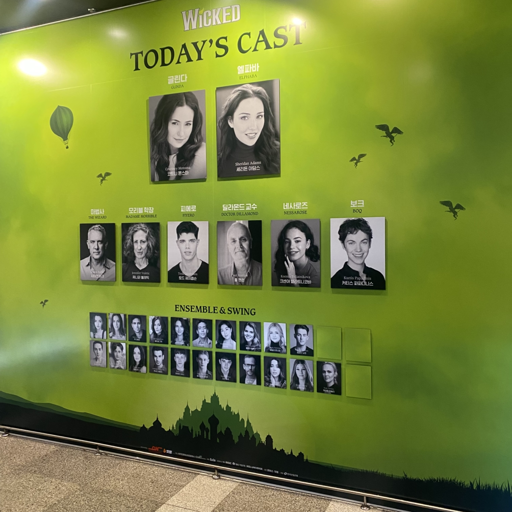 사람들이 많이 서 있었고 우리는 바로 들어갔다. 위키드 공연이 시작하고, 1부까지는 영화에서 본 내용을 압축해서 빠르게 넘어갔다. 중간에 기술적인 문제가 있어서 멈추기도 했지만, 다시 잘 시작했다. 다시 할 때 관객들이 박수를 크게 치면서 격려해 줘서 나도 기분 좋았다. 영화보다 훨씬 템포가 빨라서 지루하지가 않았고 무대장치들이 들어가고 나가고 하면서 무척 재미있었다. 그리고 1막이 끝날 무렵이 압권이었다. 엘파바가 하늘 위로 날아 오르고, 스테인드 글라스 불빛 같은 조명이 사방으로 교차하면서 엘파파는 빛에 감싸이고 초록색 노란색으로 빛나며 defying gravity를 부르고, 바닥은 형형색색으로 빛났다. 너무 장관이었다.