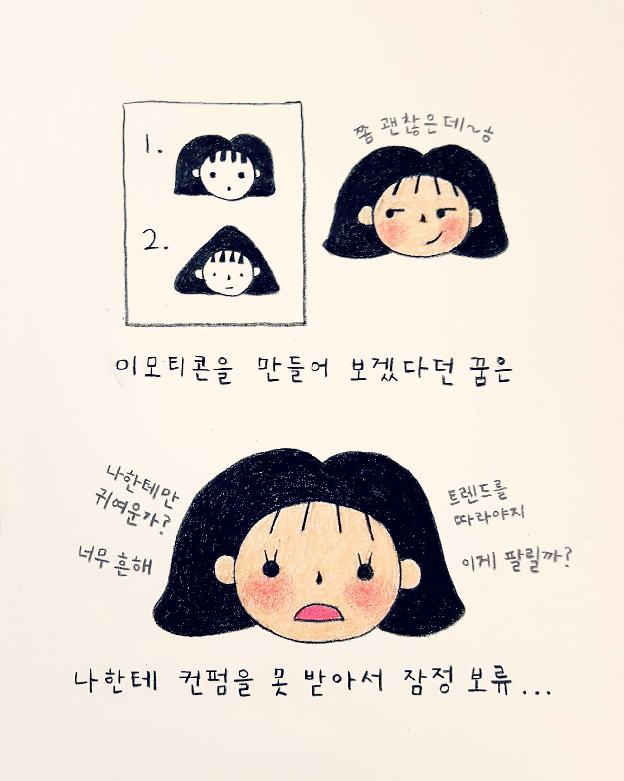 내가 그린 그림들이 하나둘 늘어갈 때마다 조금씩 욕심이 생기기 시작했다. 상품화를 해보면 어떨까 조심스레 생각했고, 그 시작은 이모티콘이었다. 나는 인기 있는 이모티콘들을 관찰하고 다양한 모양의 눈코입을 조합해가며 조금씩 나만의 캐릭터를 만들어 나갔다. 그렇게 몇 번의 수정을 거쳐 만들어진 캐릭터는 제법 마음에 들었다.