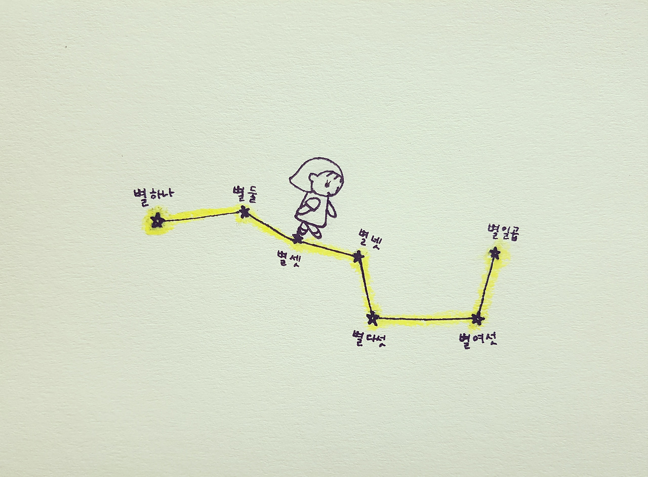 지난 밤에 보았던 북두칠성은 사랑하는 이들과 함께였기에 더욱 빛났어. 날이 밝으면 북두칠성은 잠시 숨어버릴 테지만 맑은 밤은 다시 일곱 개의 별을 데려오겠지? 그 때에 일곱개의 별을 다 건너면, 우리가 함께였던 그 밤을 기억하게 될거야.