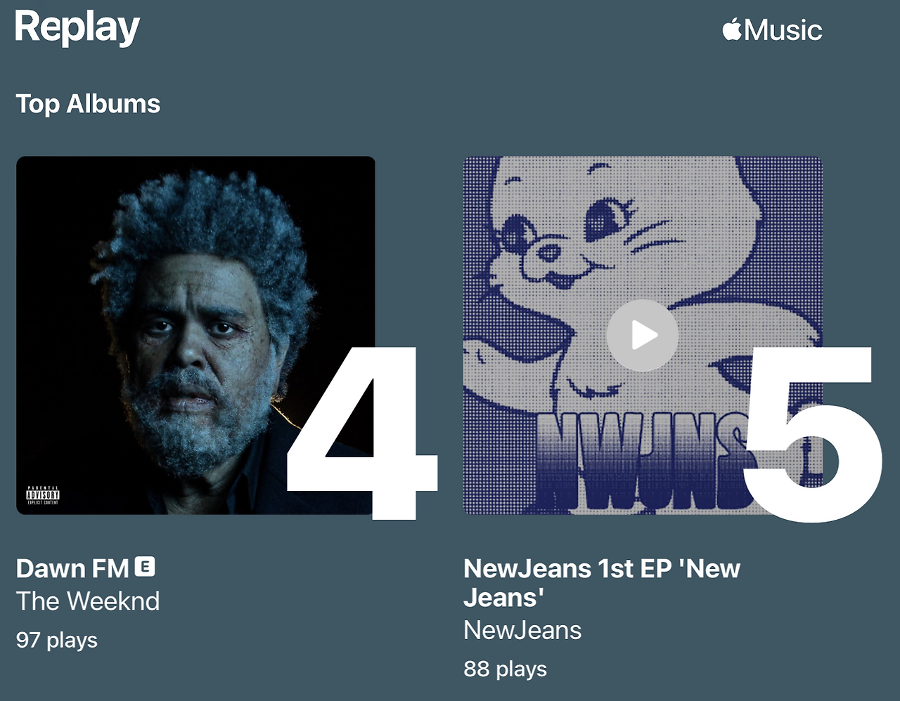 이렇게 세련된 아이돌 음악은 오랜만이다. 모든 트랙에서 세련됨이 흘러넘친다. 아이돌이라는 편견에 갇혀 부정적인 시선을 가지고 듣다 보면 어느새 귀가 녹아내린다. 괜한 반발심에 병적으로 아이돌 음악을 듣지 않고는 하는데, 뉴진스는 단 네 곡의 데뷔 앨범으로 내 '올해 가장 많이 들은 앨범' 5위를 차지했다(K팝 아이돌의 데뷔 앨범이 5위를 했다는 것도 대단한 성과다). 다만 문제는 이제 후속 앨범일 듯하다. 한두 곡의 괜찮은 노래와, 정성이 들어가지 않은 열곡의 노래로 앨범을 양산하는 실수를 하지 않기를 간절히 바라본다. 나의 최애곡은 타이틀 <Attention>