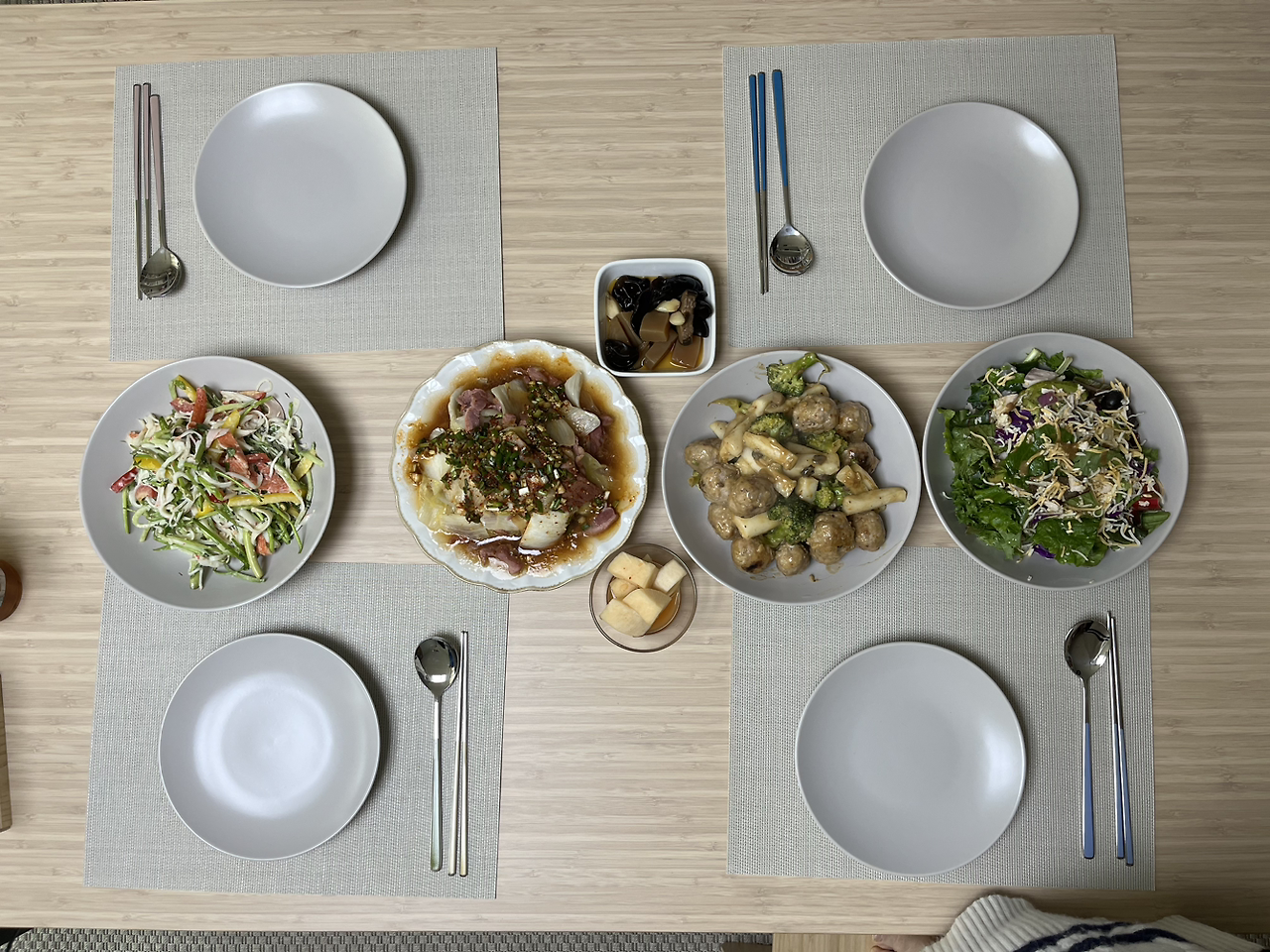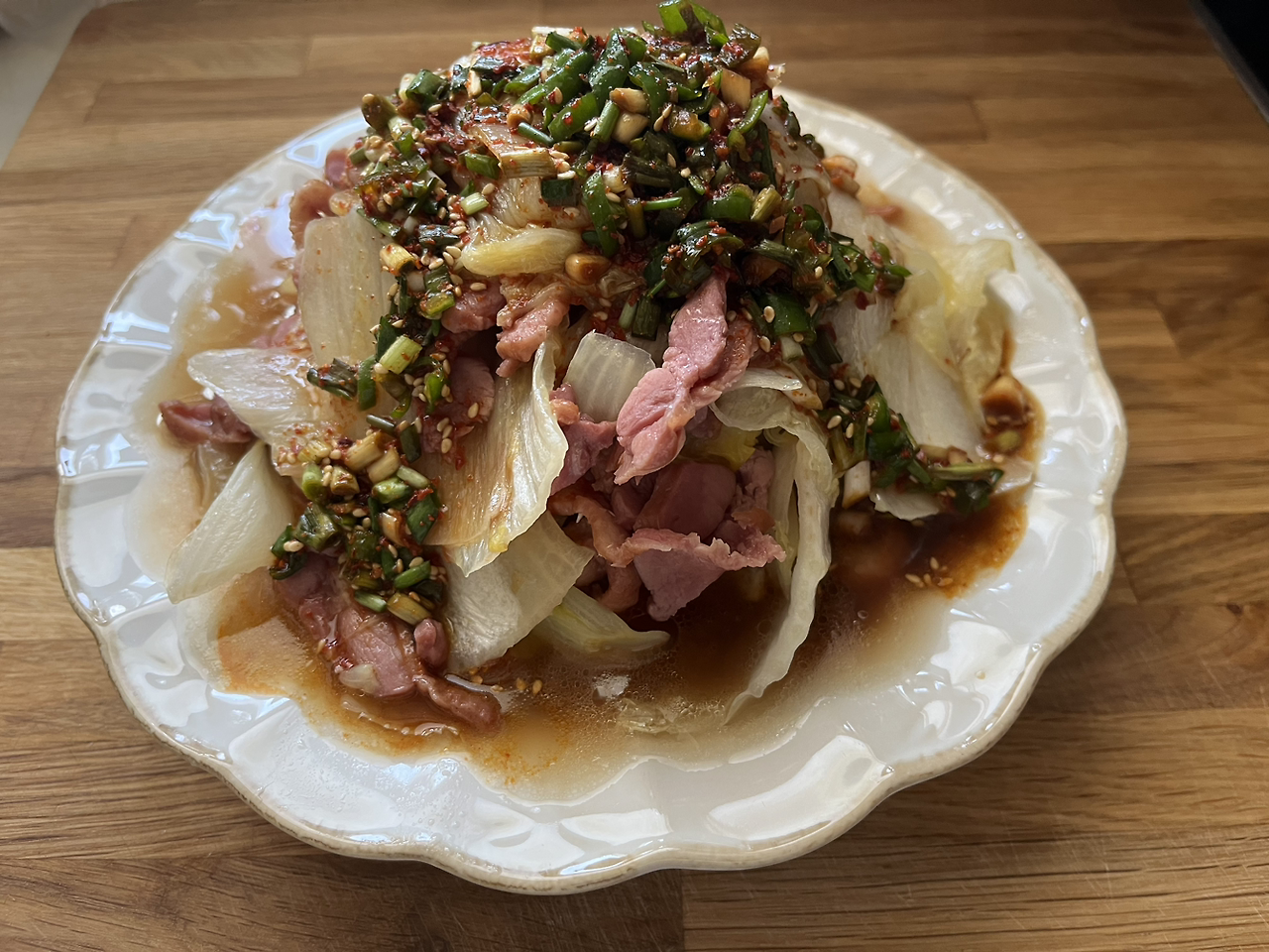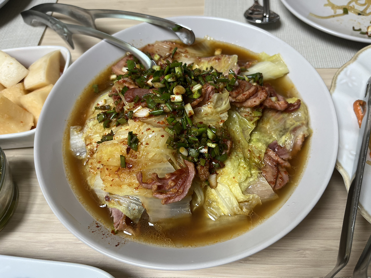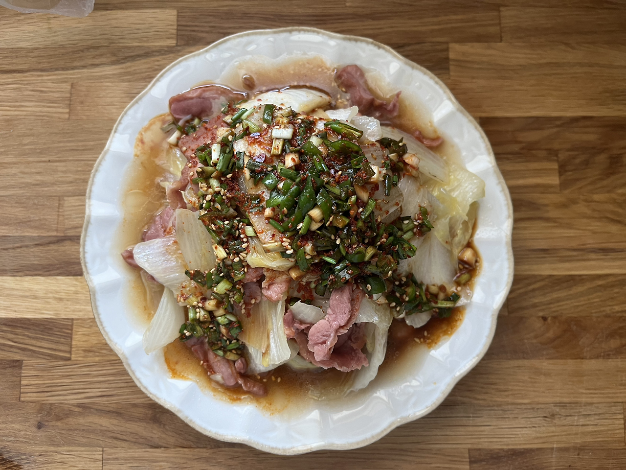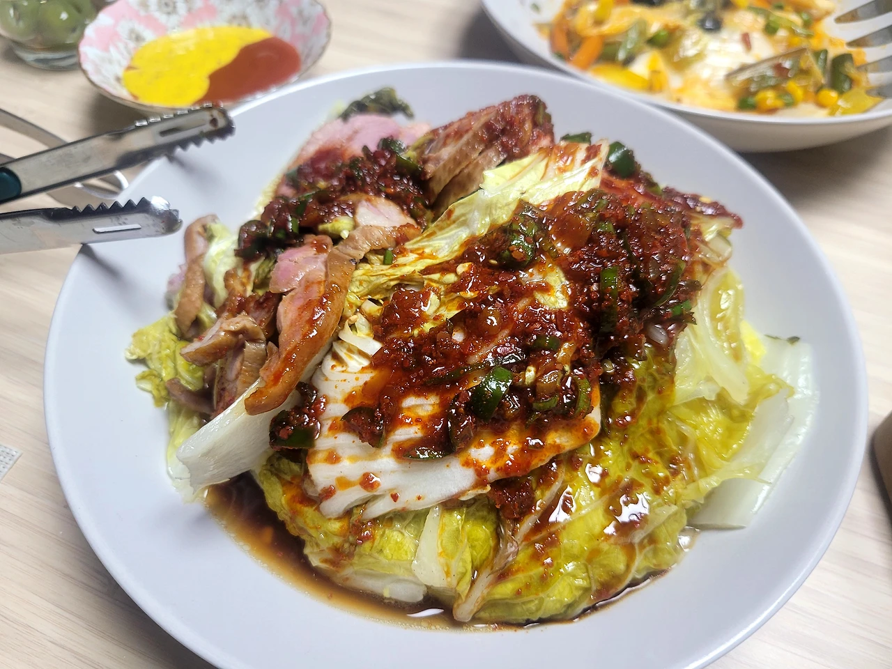 예쁜 접시에 잘 익은 오리와 배추를 적당히 보기 좋게 올려놓고 양념장을 뿌려준다. 그리고 상에 내면 끝.