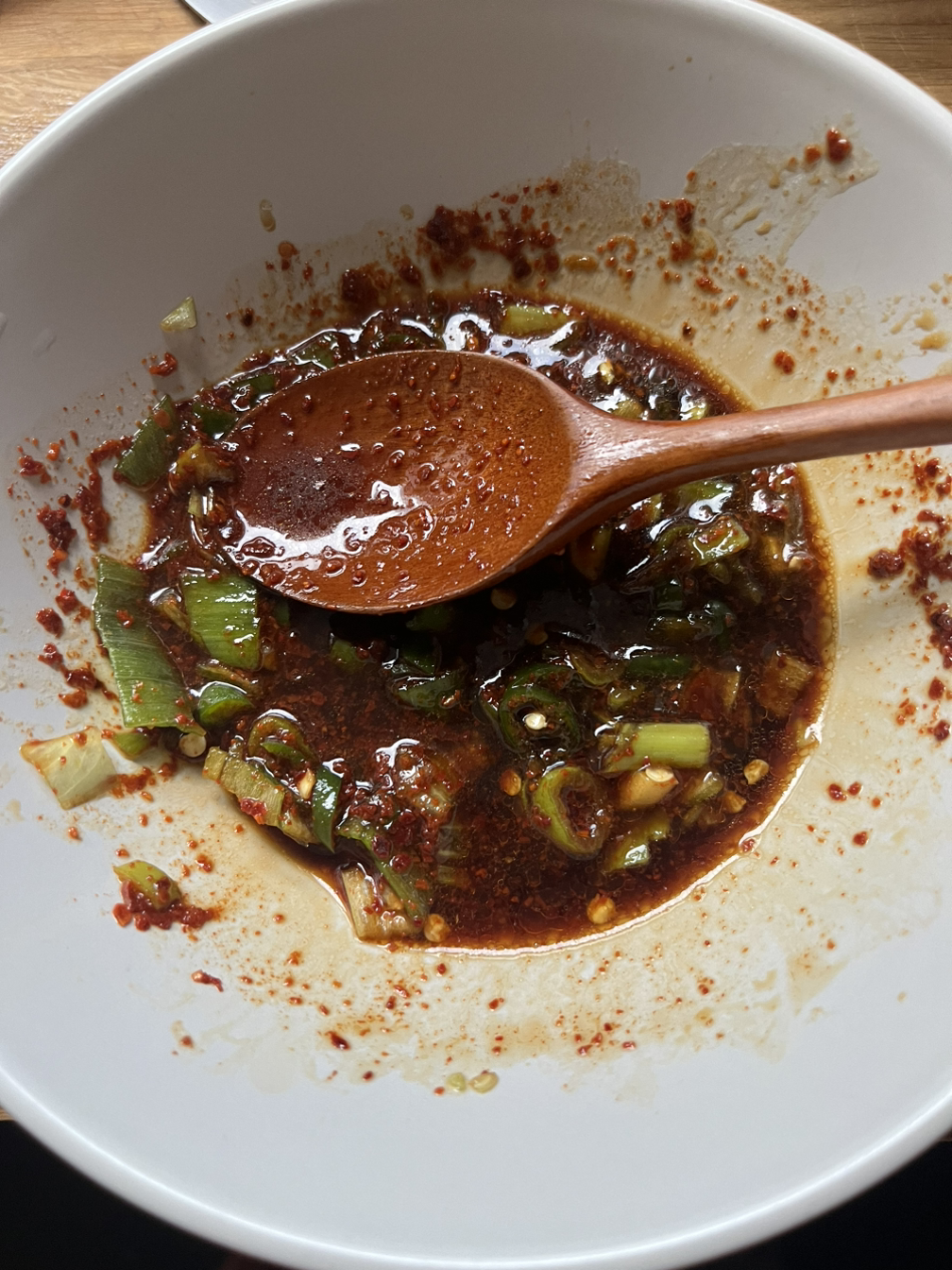 간장은 마법의 소스다. 간장 들어간 음식은 어지간하면 맛이 없을 수가 없다. 알배기 오리찜에도 간장이 들어간다. 간장을 베이스로 다진 마늘, 청양 고추 2개, 식초, 매실액, 고춧가루, 깨소금까지 넣어 주면 양념장도 끝난다. 자 이제 요리는 95% 완성됐다.