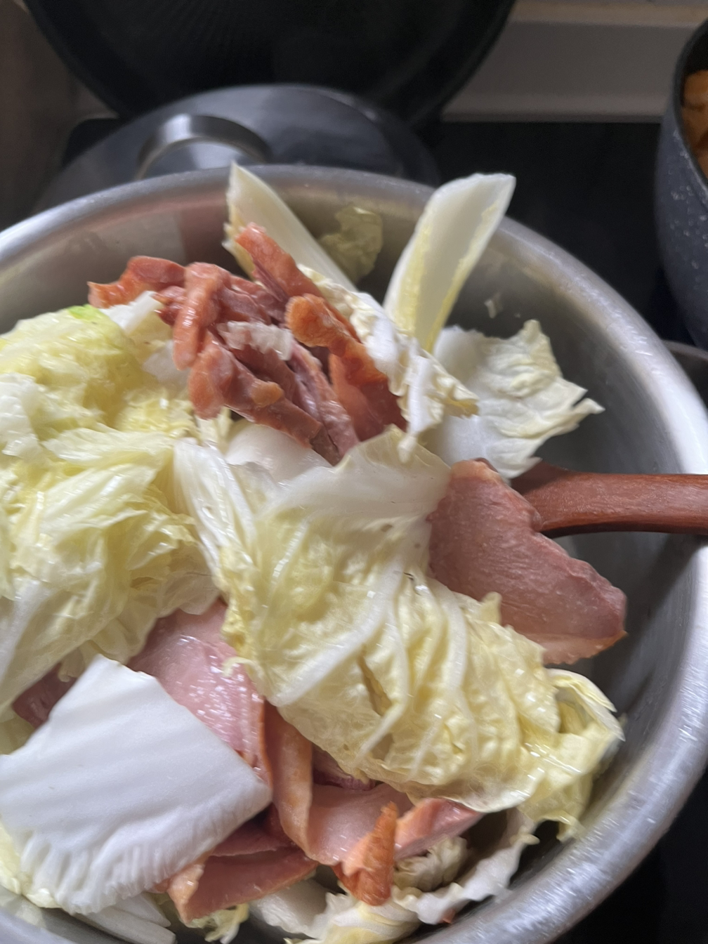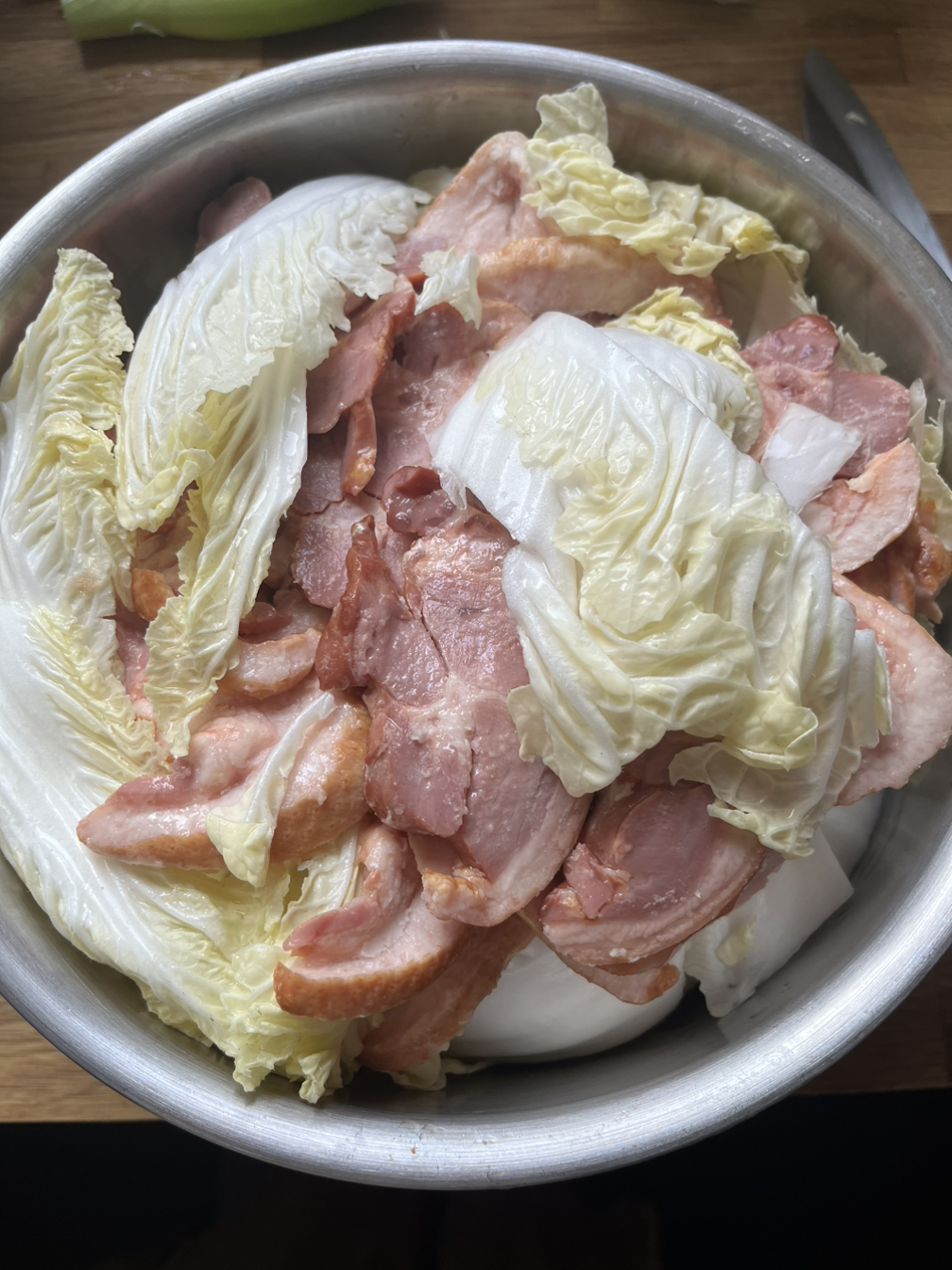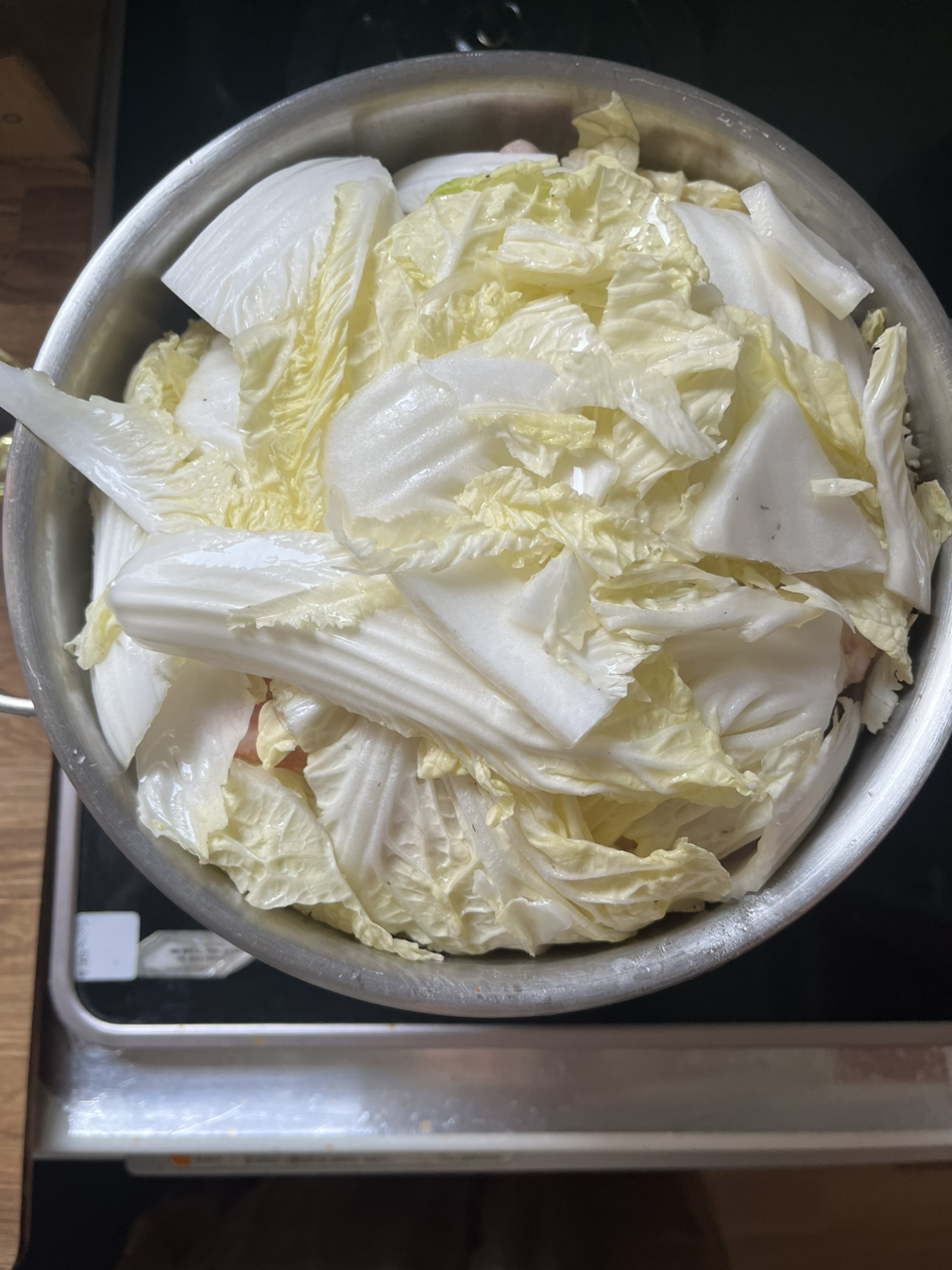 배추를 한 입 크기로 댕강댕강 잘라 식용유를 살짝 두르고 배추 한 층, 오리 한 층, 층층이 엇갈리게 쌓는다.