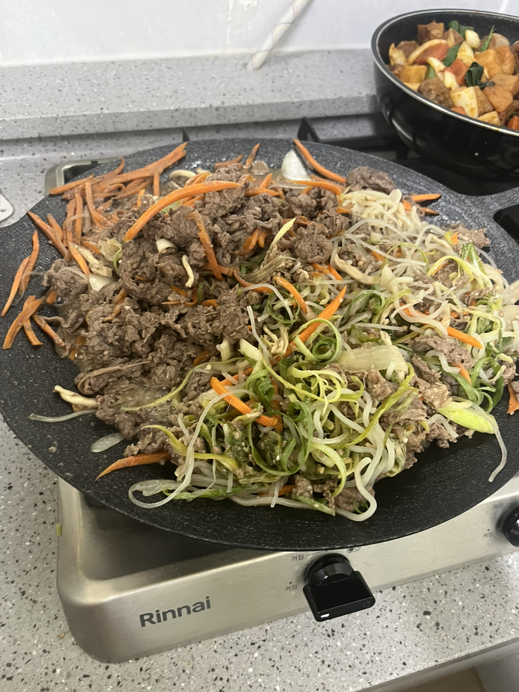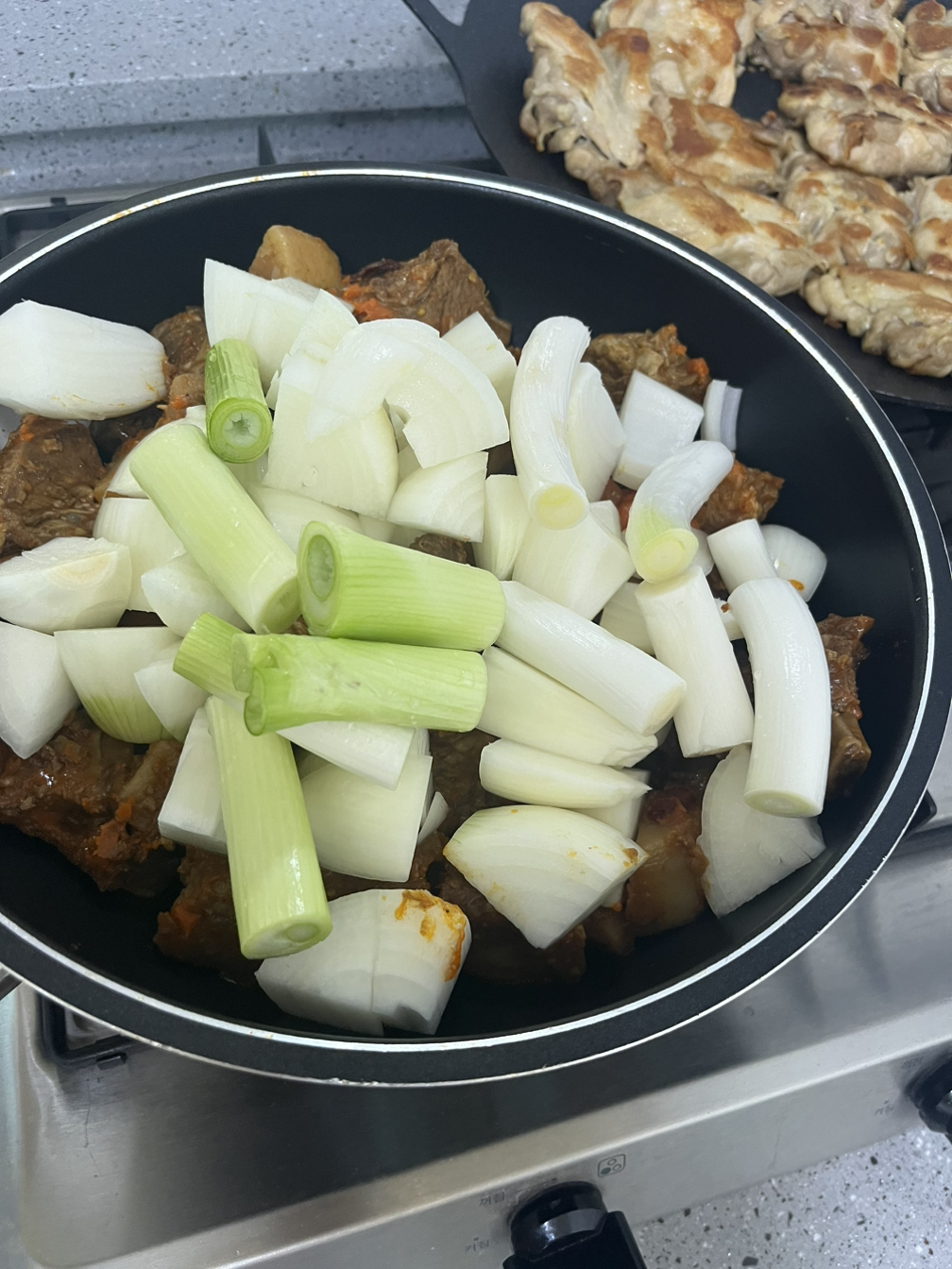 돼지갈비는 만들어 갔다 핏물을 6시간 정도 뺐다. 돼지 잡내가 나는 걸 싫어하기 때문이다. 피 다 빼고 삶아 낸 후 양념을 해서 40분 정도 졸여서 만들어 갔다. 매콤돼지갈비 양념을 조금 넣고 고기 크기만 하게 감자와 당근을 함께 넣어 익혔다, 매실액과 고추장, 고춧가루, 다진 마늘 등을 넣어 완성했다. 상 차리기 전에 대파와 양파를 넣고 살짝 익혔다. 숨이 너무 죽지 않을 정도로만.