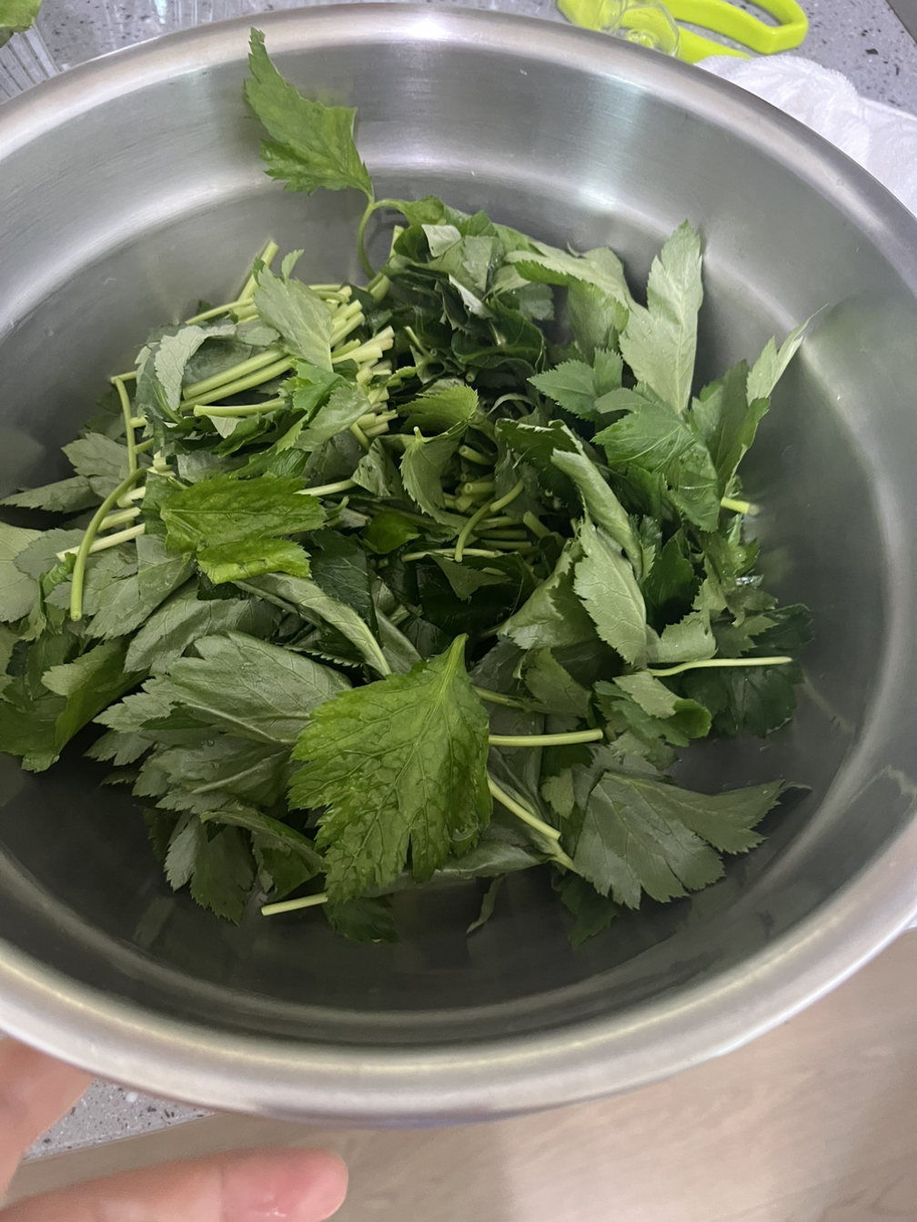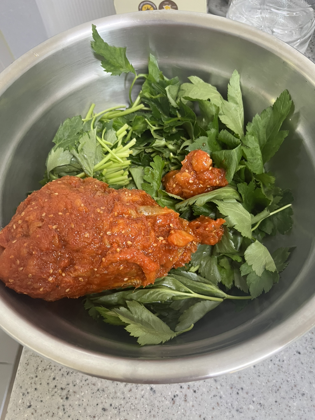 참나물을 먹기 좋게 자르고 사치큰하게 익은 명태 회무침을 쓱쓱 섞는데, 너무 심하게 섞으면 안 된다. 부드럽게 살살 만져 줘서 참나물과 명태 회무침이 잘 섞이게 한다.
