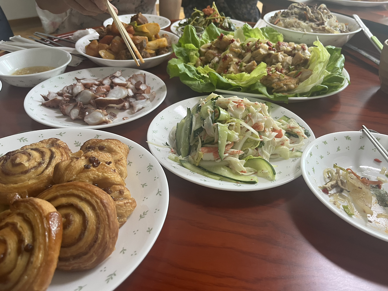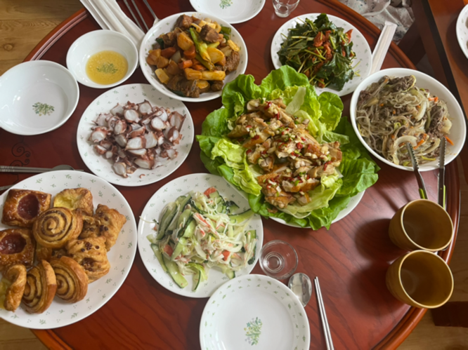 조리한 음식들을 두 개씩 담아서 상에 내고 문어숙회도 썰어서 차렸다. 요리하는데 시간은 좀 걸렸지만 맛있게 잘 먹고 속이 든든해진 하루였다.