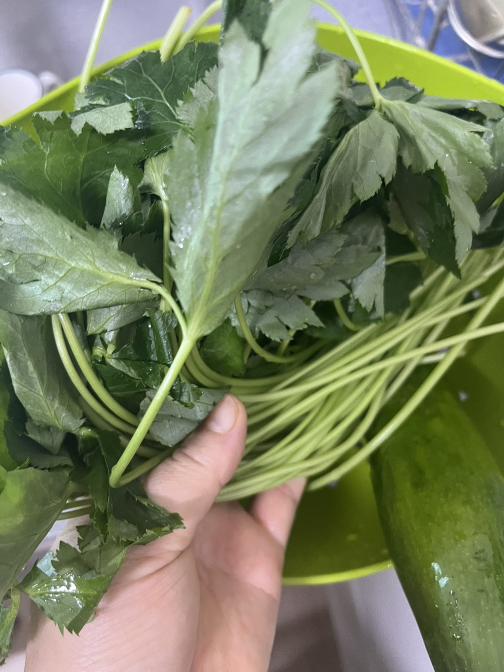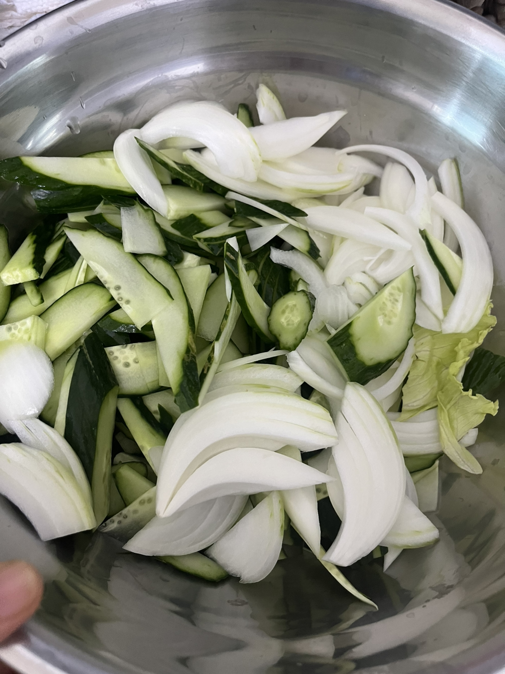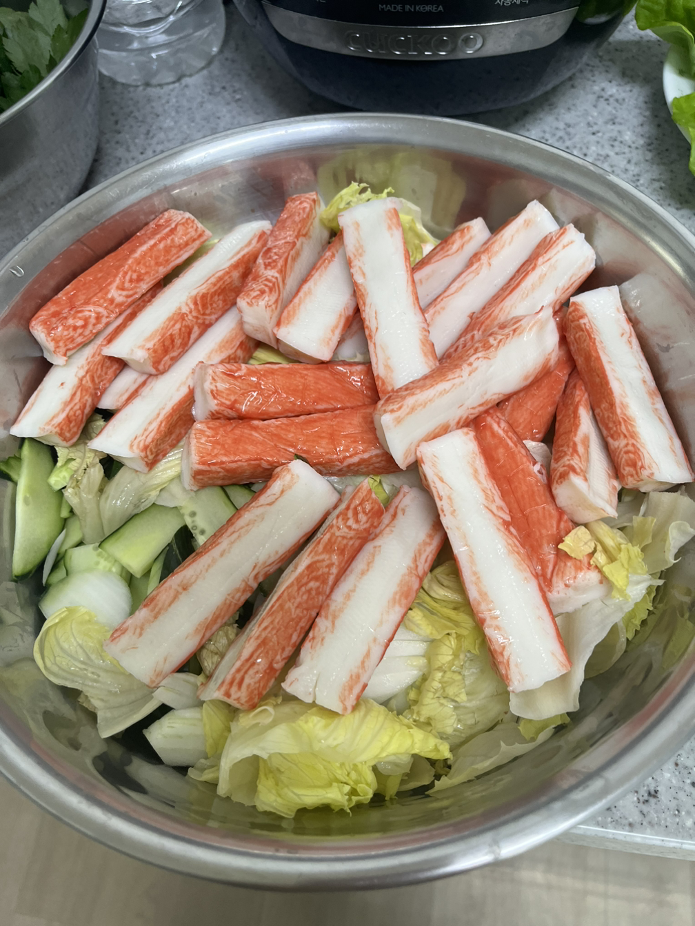 오이를 베이스로 한 크래미 샐러드. 양파와 오이를 먹기 좋은 크기로 썰고 각종 채소도 넣는다. 크래미도 잔뜩 넣고 마요네즈 약간 에, 제일 중요한 생와사비를 넣고 버무린다. 크래미는 먹기 좋게 결 따라 찢어준다.