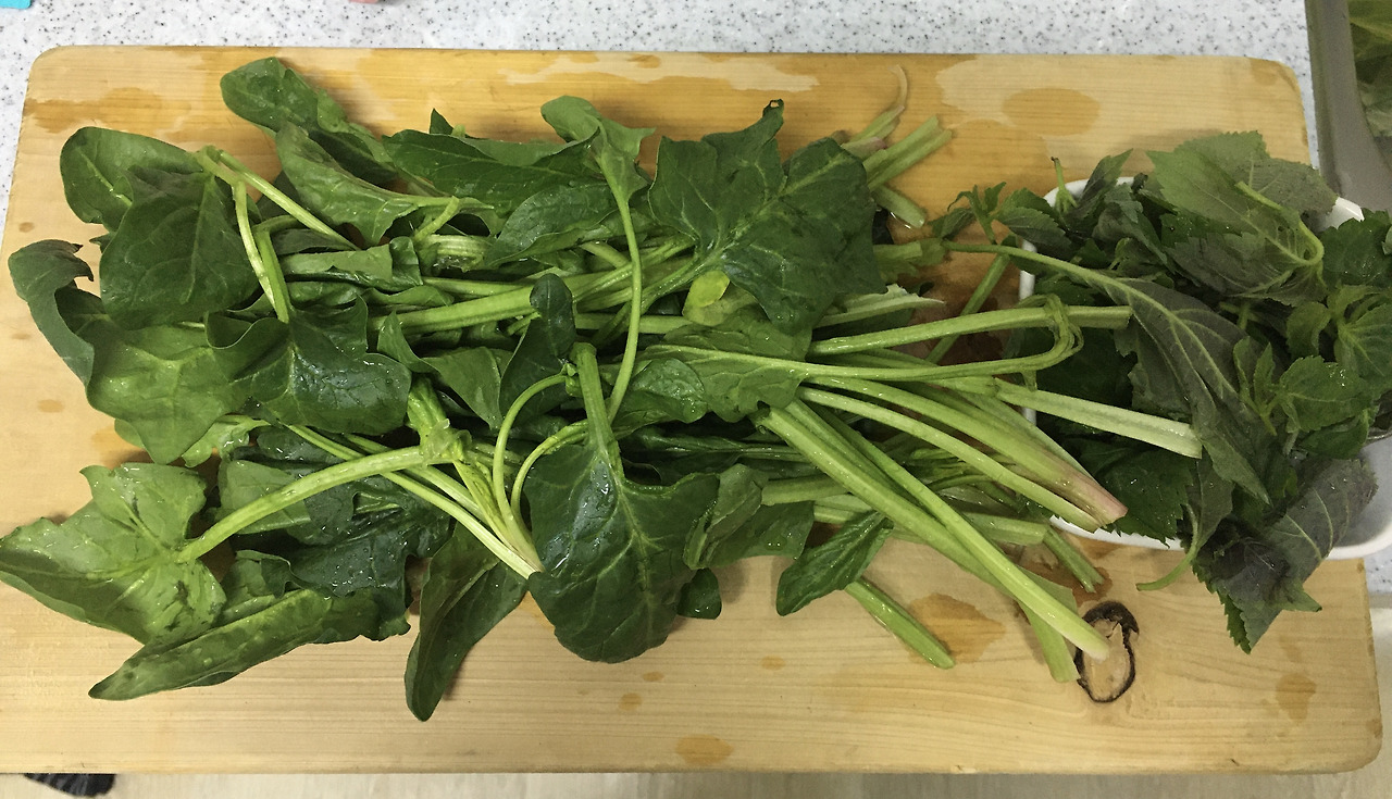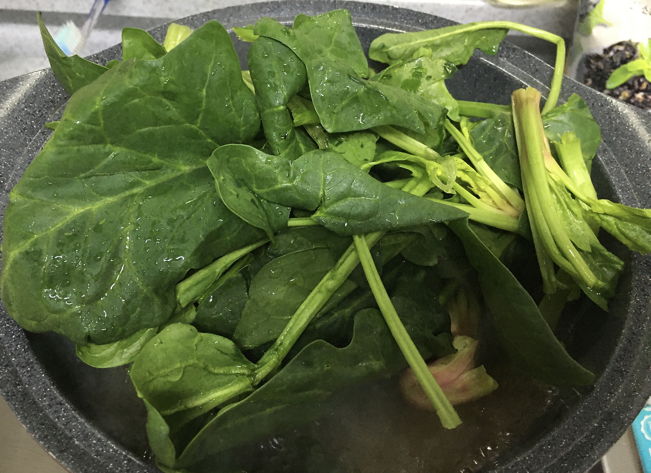 여러 번 씻은 시금치와 바라 깻잎을 준비했다. 대파 가격이 너무 비싸서 사지 않았다. 요즘 요리 잘 안 해 먹는다는 소리다.