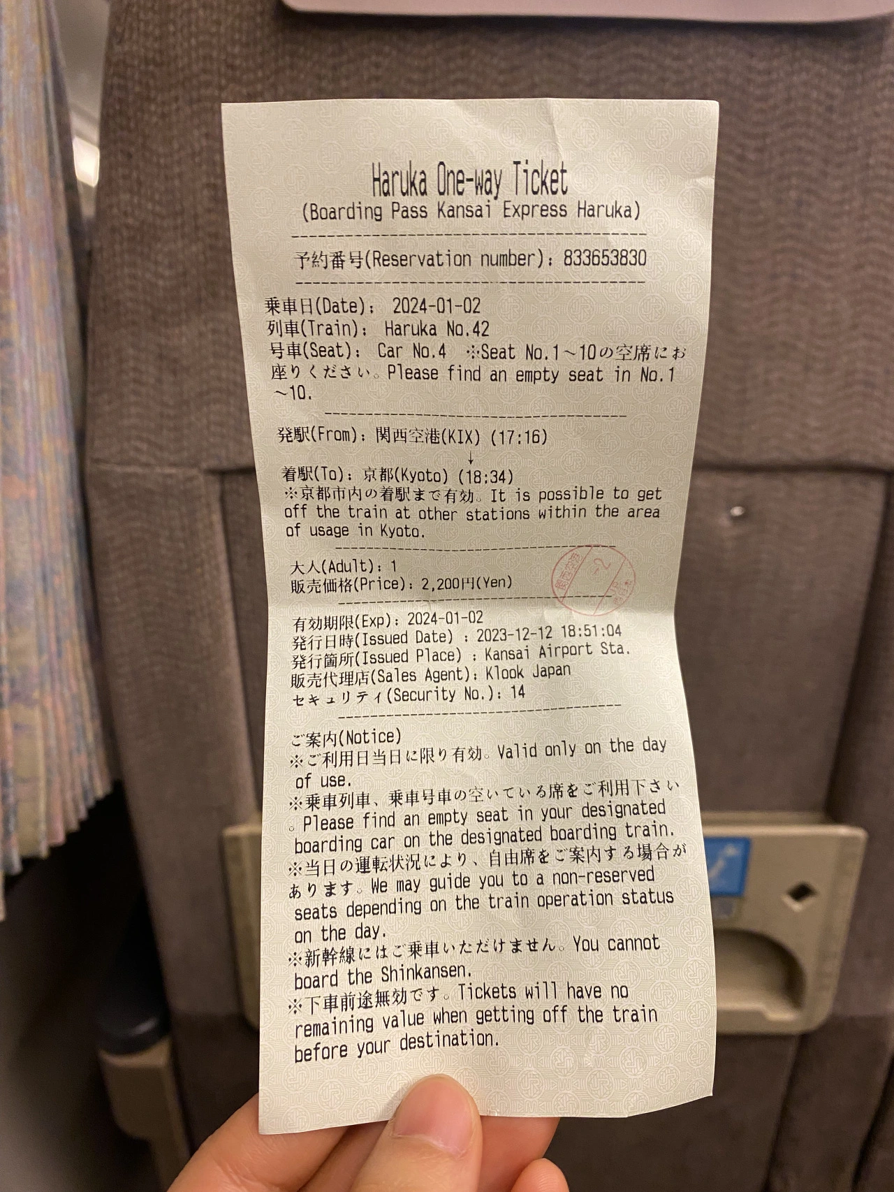 간사이국제공항에 도착해서 하루카특급열차 티켓을 구매할 수 있지만 온라인으로 티켓을 미리 구매하는 게 훨씬 저렴하다. 여러 사이트에서 하루카 티켓을 판매하고 있는데 나는 클룩에서 구매했다. 간사이에서 교토로 가는 이동편 뿐만 아니라 다른 교통편들도 클룩에서 구매가 가능했기 때문에 클룩을 이용했다.