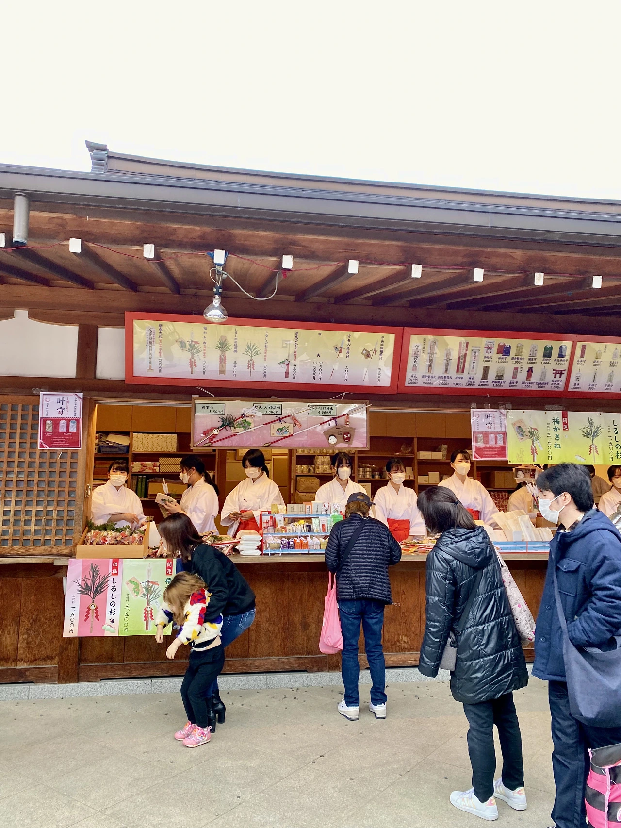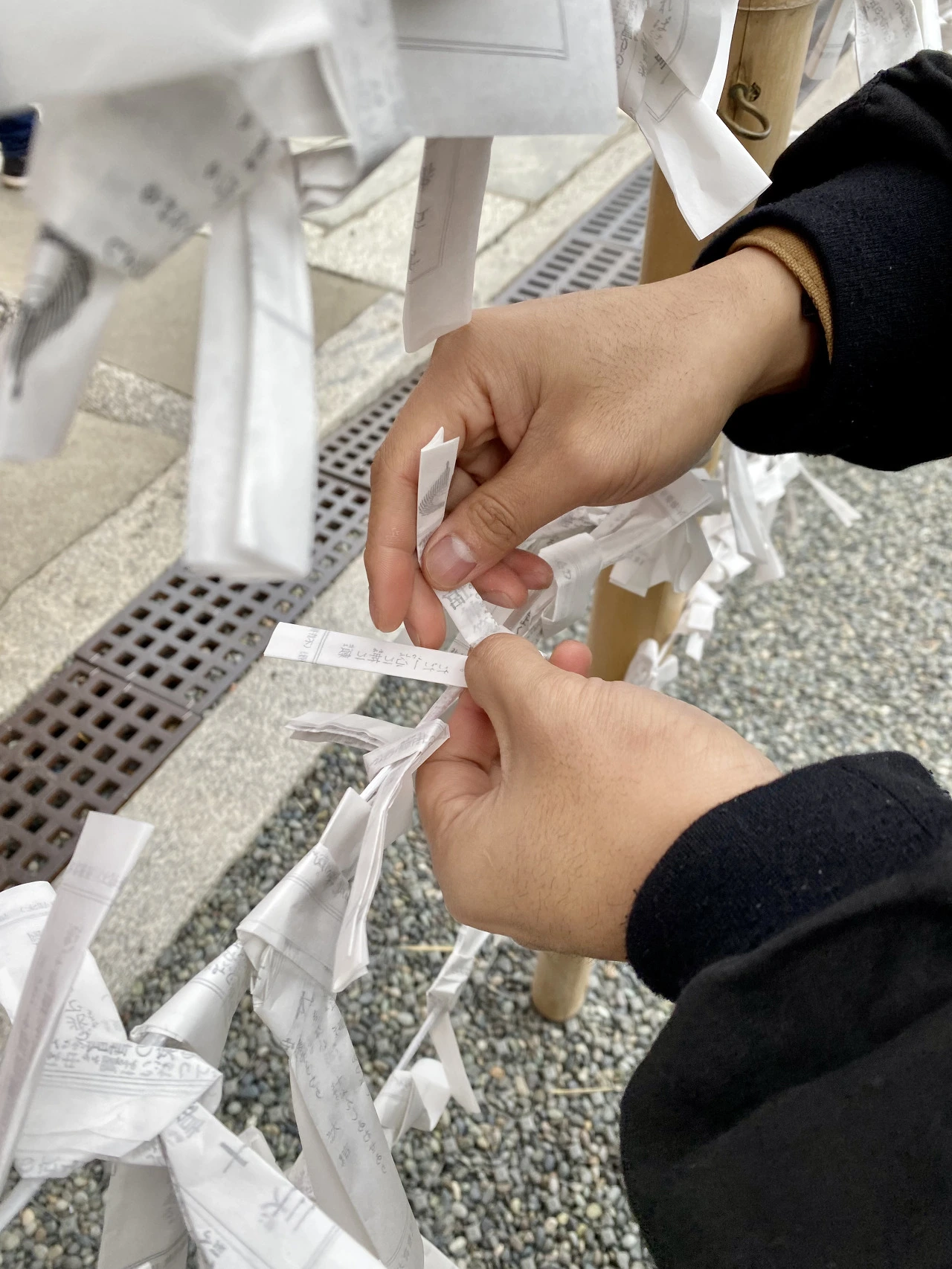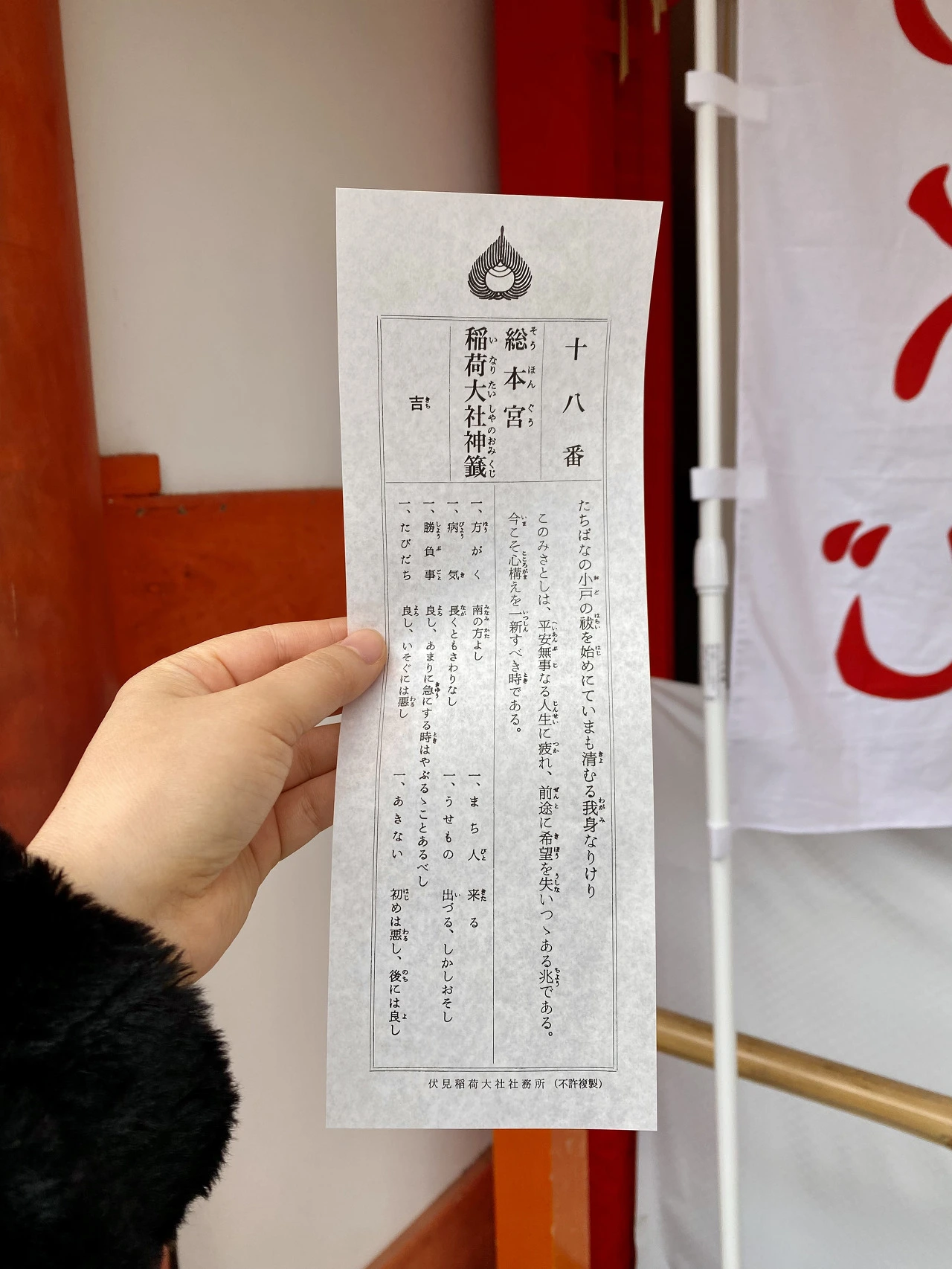 신사 입구에서 신년 운세 뽑기를 하고 있었다. 뽑기 통을 흔들면 랜덤으로 막대기 하나가 나오는데 그 끝에 적힌 숫자를 신녀에게 말해주면 운세 종이를 건네준다. 내가 뽑은 번호는 18번, 운세 뽑기 비용은 200엔이었다. 사람들이 여기저기서 운세 종이를 들고 읽는 모습이 귀여웠다. 만약 좋지 않은 운세를 뽑았을 땐 액운을 묶는 기둥에 운세 종이를 묶어두고 오면 된다.
