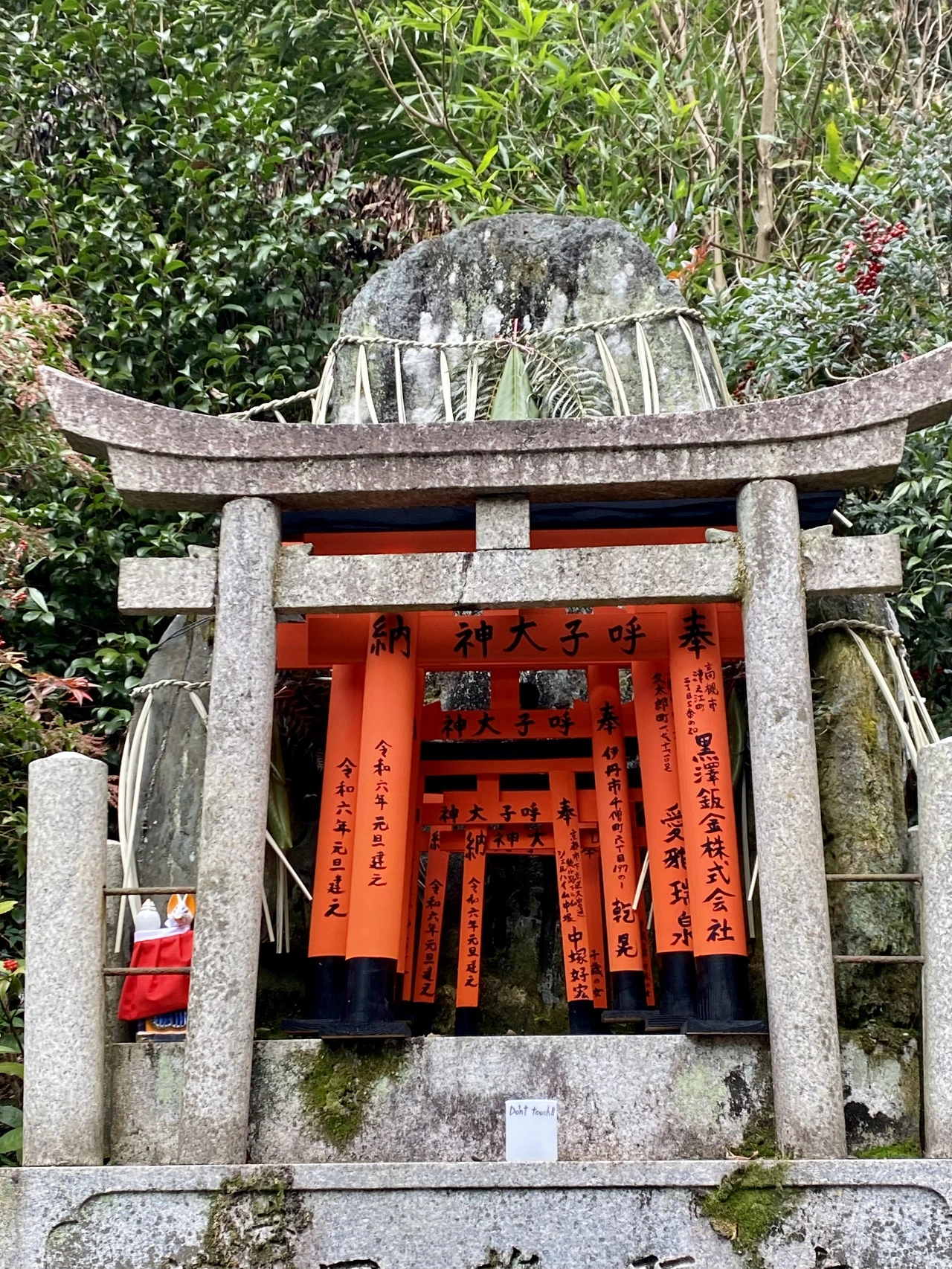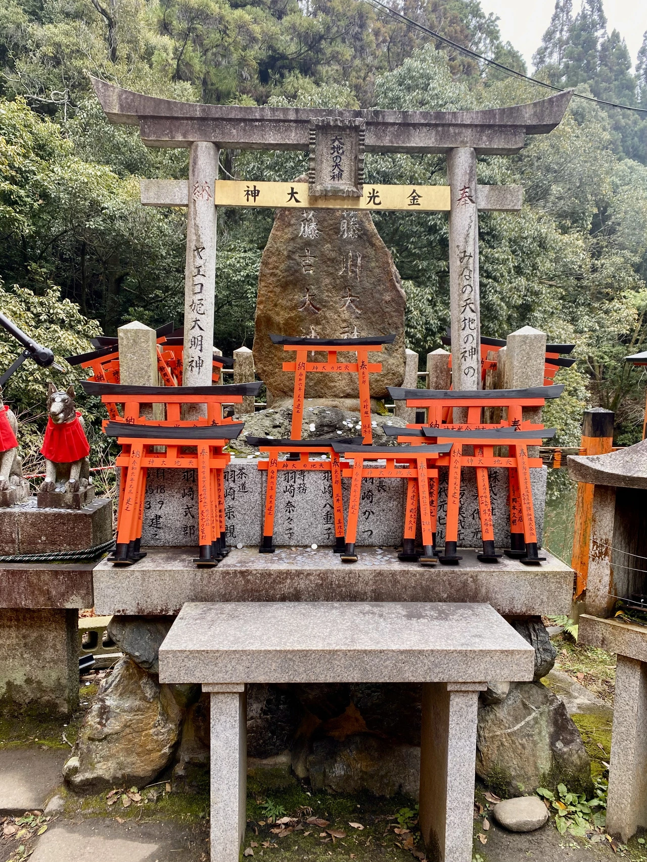 후시미이나리 중간 영역까지만 와도 곳곳에 설치된 작은 신당들과 소형 도리이를 많이 볼 수 있다. 대형 도리이는 얼마인지 알 수 없었지만 작은 도리이는 5,000엔에 판매하고 있어서 개인도 부담 없이 구매 가능하다. 도리이의 앞면은 아무 글자도 없지만 뒷면에는 기부자의 이름이 쓰여있다. 나도 나중에 도리이를 기부하며 내 이름을 한글로 새기면 어떨까 생각했다.