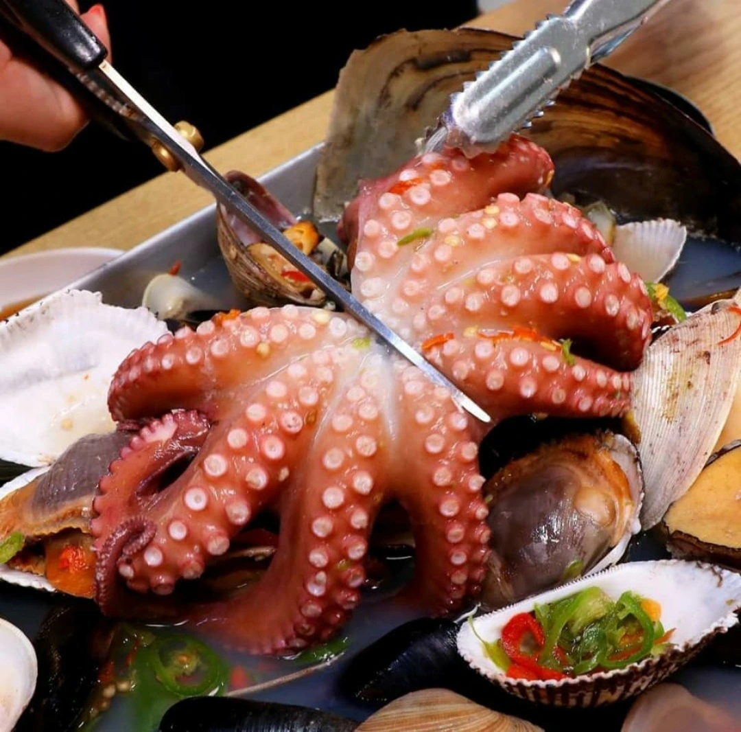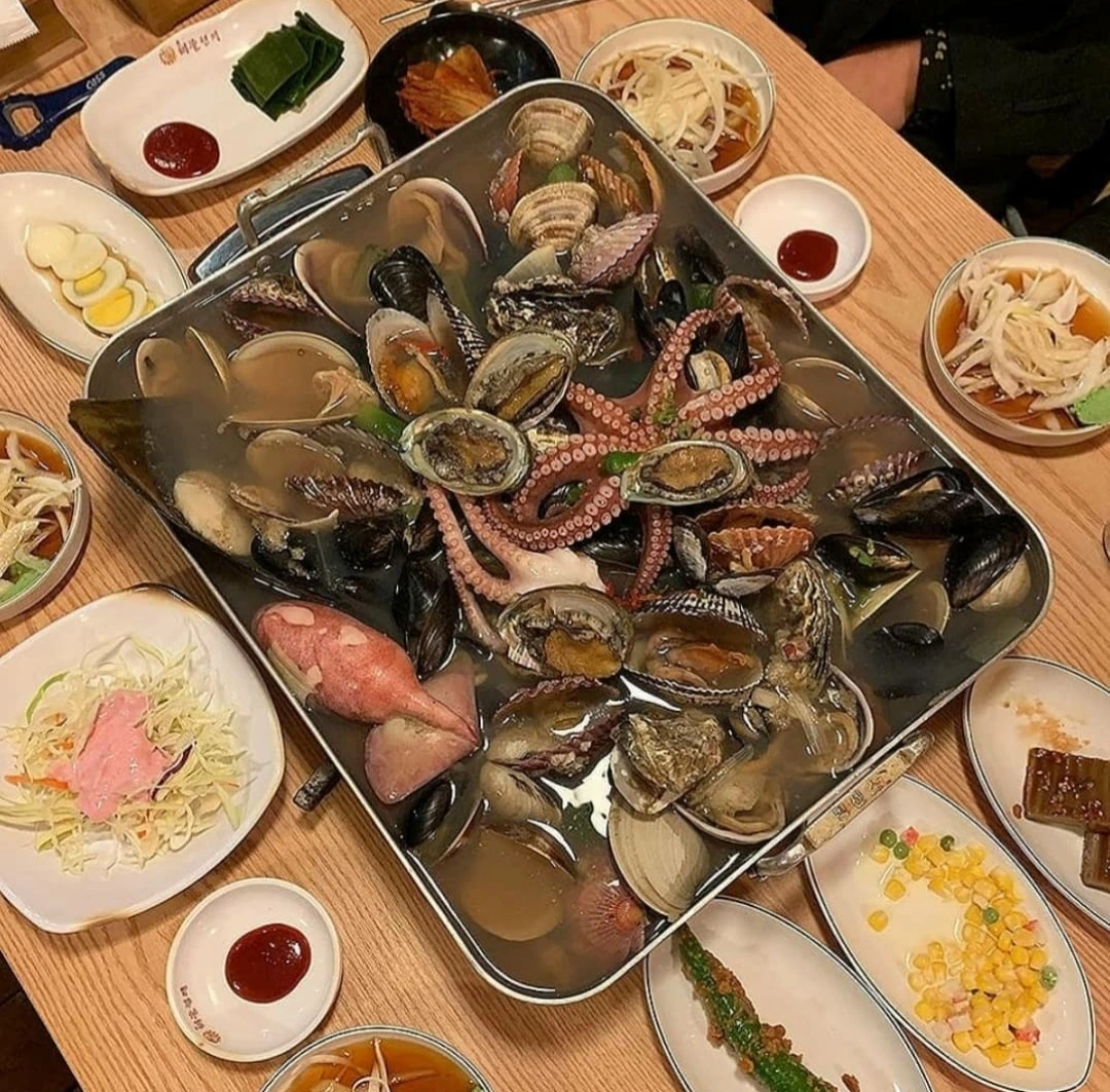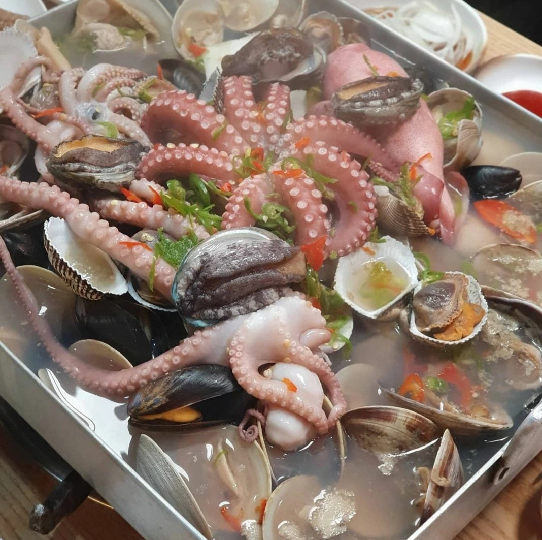 주문하고 기다리면 깔끔한 밑반찬이 먼저 나오고 뒤이어 메인 메뉴 조개 전골이 나온다. 이 비주얼을 보고 사진을 안 찍을 수가 없다. 철판을 가득 채운 싱싱한 조개와 해산물이라니. 심지어 전복은 살아서 꿈틀거리는 중이다. 동영상까지 찍어서 인스타에 올리면 지인들이 어디냐고 한 번씩 꼭 물어본다. 그때의 뿌듯함이란.
