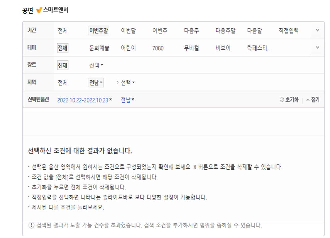 포털사이트 다음에서 공연을 검색한다. 기간은 이번 주말, 테마 '전체', 장르 '전체'로 설정하고 지역을 '전남'으로 설정한다. 선택하신 조건에 대한 결과가 없다는 메시지가 뜬다.