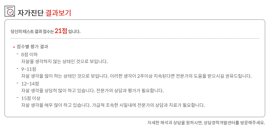 이 정도일 줄은 몰랐는데 점수가 꽤 높았다. 의외였다. 하지만, 걱정은 마시길. 나는 내가 절대로 자살 같은 건 할 수 없는 인간이라는 걸 잘 안다. 겁이 많아서 병원도 잘 못 가는데 자살이라니. 말도 안 된다.