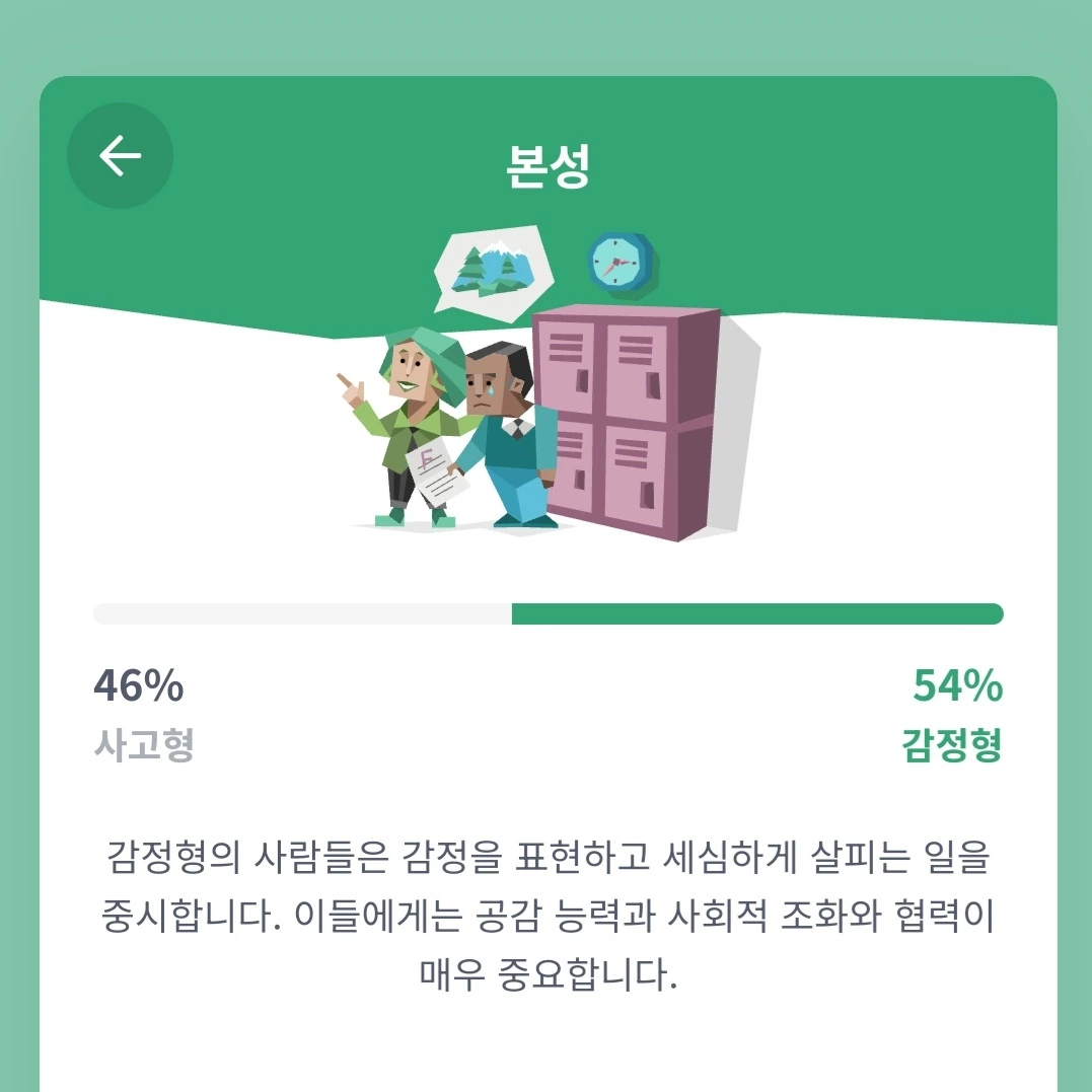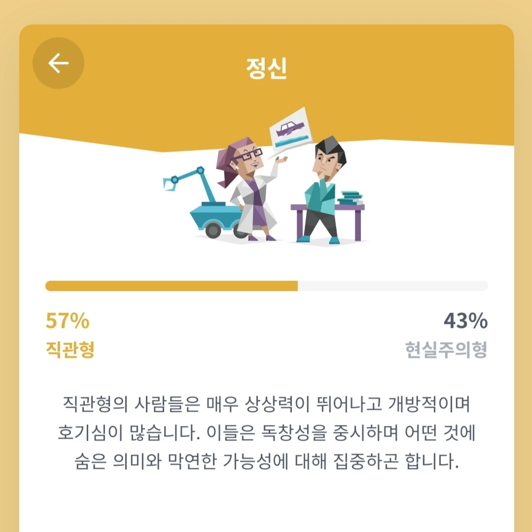 MBTI에 열광하는 사회 분위기에 휩쓸려 MBTI 광팬이 된 나 스스로가 만든 INFP라는 감옥에 갇혀버렸다는 걸 깨달았을 때쯤, 내가 정말 INFP는 맞는 건지 궁금해졌다. 아닐 수도 있지 않을까? 그때는 INFP였지만 지금은 달라지지 않았을까? 그래서 내 소중한 12분을 들여 다시 검사를 해봤다.