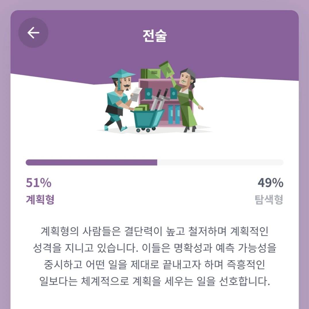 나는 내향형이긴 하지만 외향과 내향이 40:60으로 크게 차이 나지는 않는다. 직관과 현실에서도 , 사고와 감정에서도 큰 차이가 없다. 심지어 계획과 탐색에서는 고작 2%의 차이만 있을 뿐이다. 이 정도 차이라면 다음번에 검사했을 때는 다시 INFP가 나와도 전혀 이상하지 않다.
