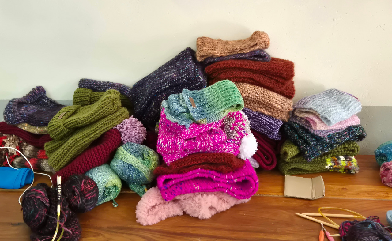 4. 야근을 마치거나 점심시간 이후 짬이 나는 대로 뜨개질도 합니다. 실은 미리 구비되어있었으며, 목도리, 모자 등등 무엇이든 떠 한쪽에 쌓아둡니다. 이는 추운 밤과 극한 일교차를 겪는 원주민분들께 전달될 것이라고 합니다.