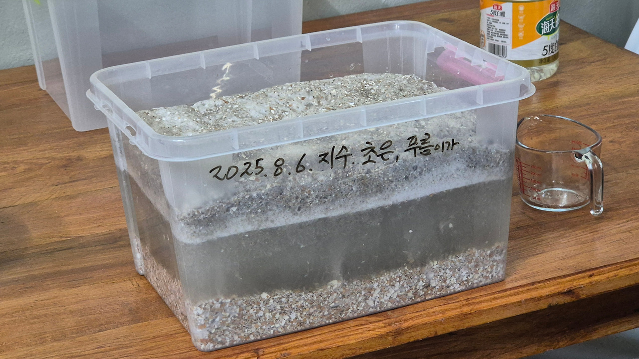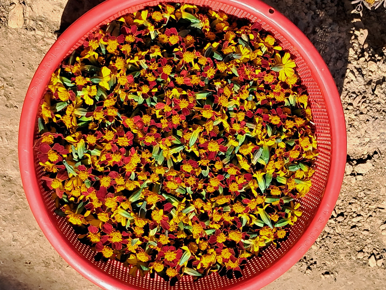 야외서 한 일을 포괄적으로 잡아 “농장”이라고 선언했을 뿐, 매일같이 그 내용은 달라졌습니다. 이를테면, 자라고 있는 아기 수박 덩굴 아래 부시를 깔아주고 액비(액체 비료 : 말린 달걀 껍데기를 으깨 식초와 적당 비율로 섞어 만듦)를 뿌려줍니다. 파도 뽑고, 무도 뽑고, 소나무도 심습니다. 꽃 차를 만들 메리 골드도 수확합니다. 차 만들기에 적절한 메리 골드를 딴 다음 세척하여 고량주에 씻기고, 덖어 말립니다. 또, 싹이 난 핑크빛 옥수수를 밭으로 옮겨 심습니다. 부시를 트럭에 옮기는 작업도 합니다.