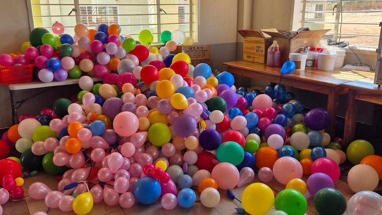 3. 공소 미사와 세례식과 같은 현지 분들과 함께하는 행사가 있는 날엔 평소보다 일찍 일어납니다. 행사에 참여하는 분들께 나누어 드릴 도시락과 풍선을 준비해야 하기 때문입니다. 동이 트기 전부터 풍선을 불고 묶기를 무한 반복합니다. 잠이 덜 꺤 채로 뇌를 비우고 손을 움직이다 보면 멋진 일출을 맞이할 수 있습니다.