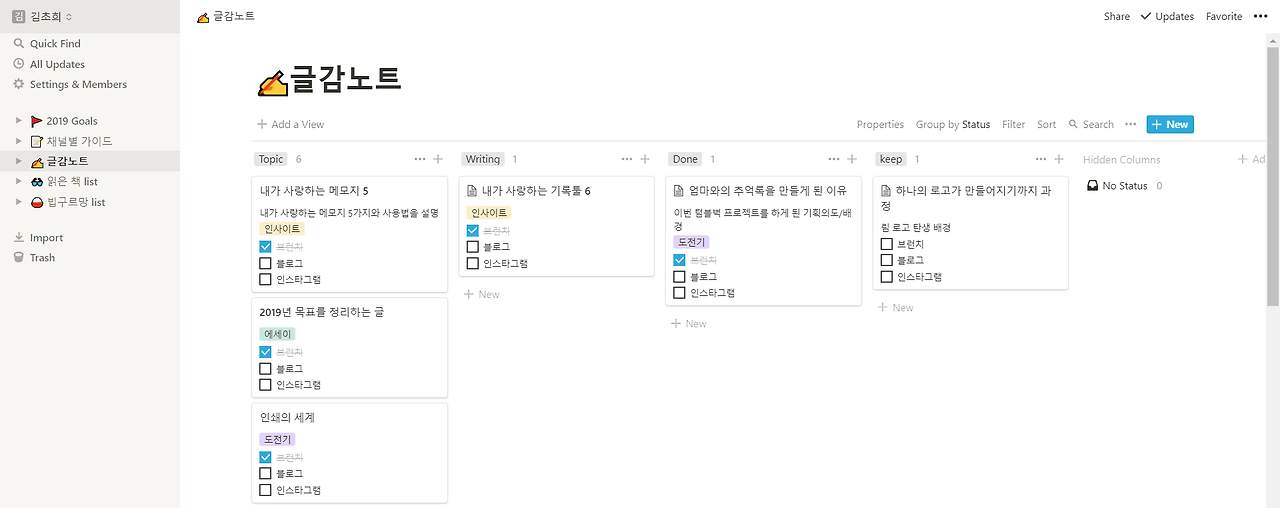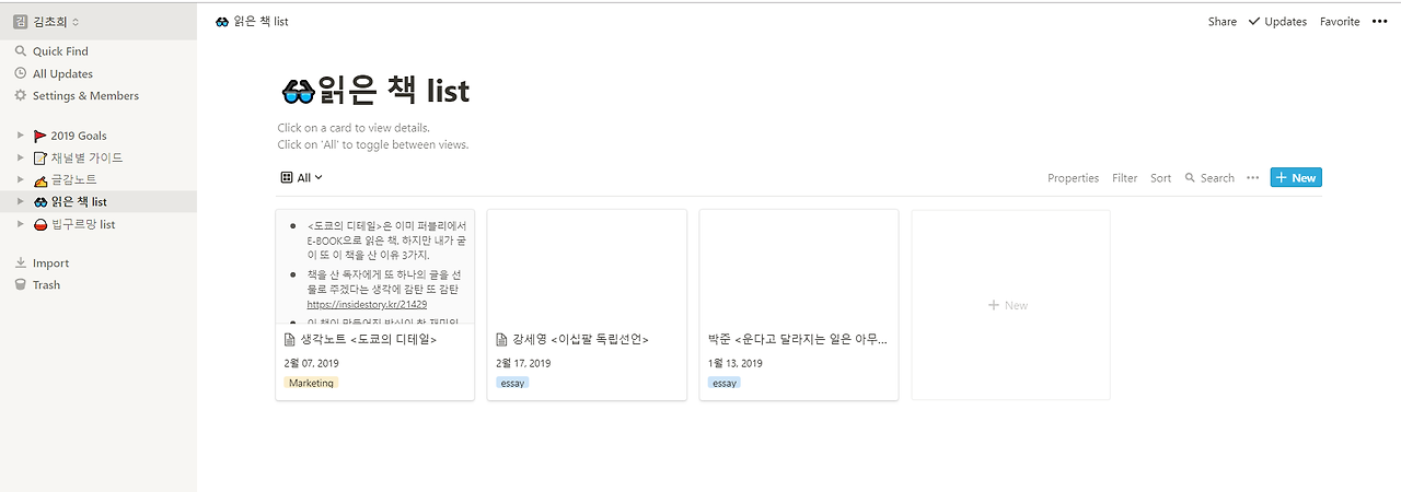 생각노트님의 글을 읽다가 알게 된 생산성 툴. 트렐로, 컨플루언스 등 여러 생산성 도구가 있지만 노션처럼 편리하고 섹시한 툴은 없을 거다. 깔끔한 UIUX, 목적에 최적화된 템플릿. 보자마자 여러 템플릿을 써보는데 취해버렸다. 시각화부터 디테일까지 어찌나 정리하기 편하게 만들었지 감탄 또 감탄한다. 회사용도 있는데 나는 개인용으로 쓰는 중. 읽은 책 리스트, 글감 진행사항, 2019년 비전 및 목표를 정리해두었다.