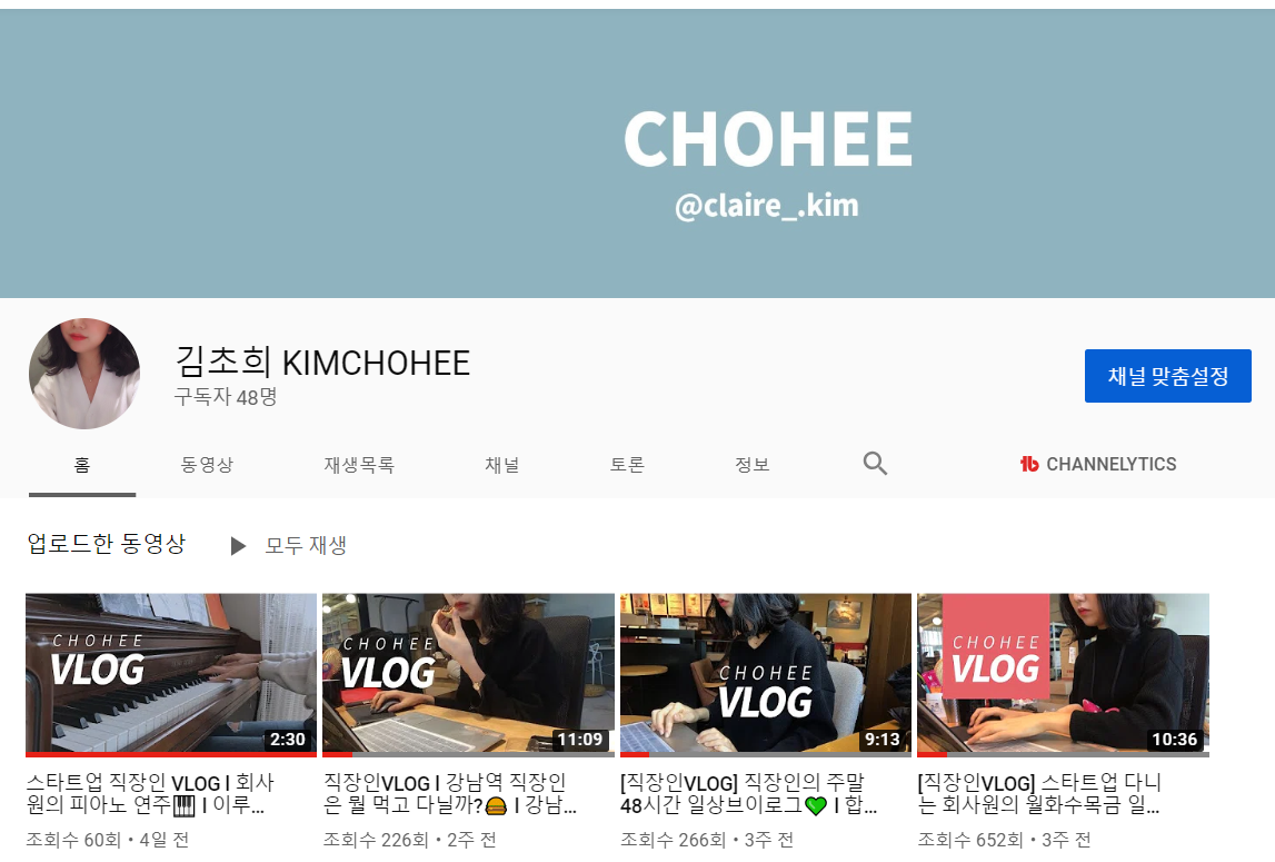 회사 일상, 퇴근 후 일상을 영상으로 기록하는 공간. 직장인 브이로그를 찍고 있고 총 4편의 영상을 업로드했다. 내가 뭘 하고 살았는지 되새길 수 있어 좋다. 다른 채널보다 한 건의 게시물을 올리기에 리소스가 많이 들어가지만, 그만큼 만들고 나면 뿌듯하고 유일한 영상 콘텐츠 채널이라 아끼는 채널.
